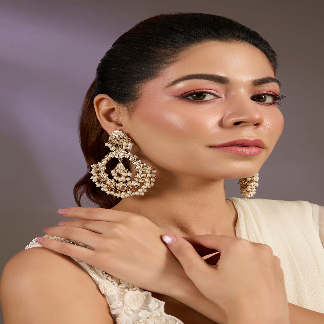 Elevate your look with VIVINIA's handcrafted Pearl Cluster Statement Earrings, designed with intricate detailing and a bold silhouette. Perfect for weddings, festive occasions, and evening celebrations.