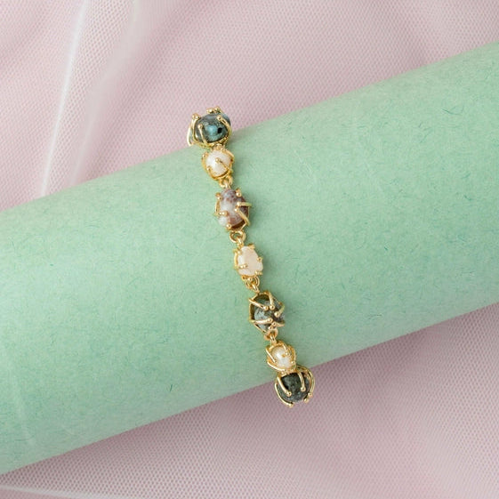 Introducing our stunning Loose Bead Bracelet in Blue, White, and Pink! This exquisite bracelet is the perfect accessory to elevate your style and add a touch of elegance to any outfit. Crafted with care, this bracelet features a beautiful combination of blue, white, and pink beads. The varying shades create a harmonious blend that is both eye-catching and versatile. The bracelet is made with high-quality materials, ensuring durability and long-lasting beauty. It is designed to easily fit most wrist sizes, offering a comfortable and adjustable wearing experience. The vibrant blue beads bring a sense of calmness and serenity, while the white beads add a touch of purity and elegance. The pops of pink beads bring a playful and feminine element to the overall design. : Adjustable Material: Brass, Freshwater Pearl, Turquoise Polish : Gold Plated Wear : Party Wear