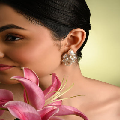 White Pearl Moon Stud Earrings - SIA449498