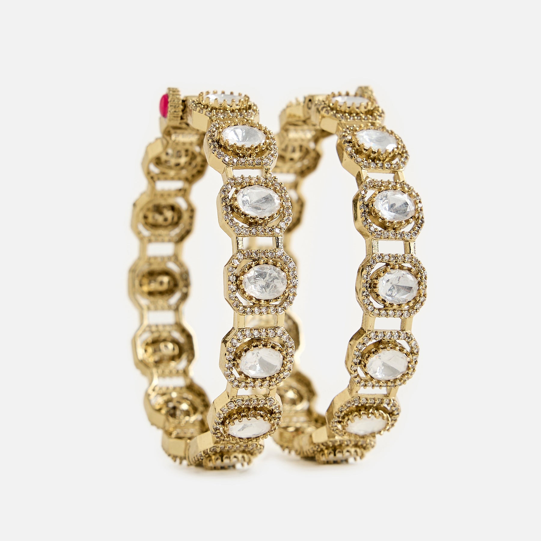 Elegant Moissanite Kundan Polki statement bracelet featuring a double row of shimmering stones with antique gold finish. A timeless piece perfect for weddings, festive occasions, and traditional celebrations.