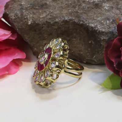 Gold-Plated Flower Kundan Polki Ring - ...