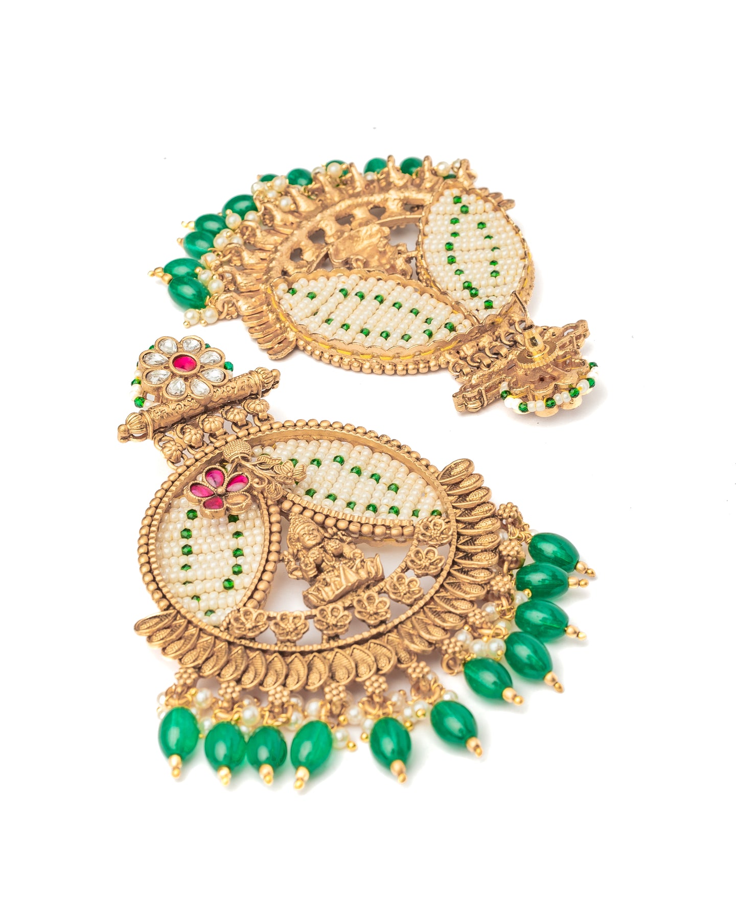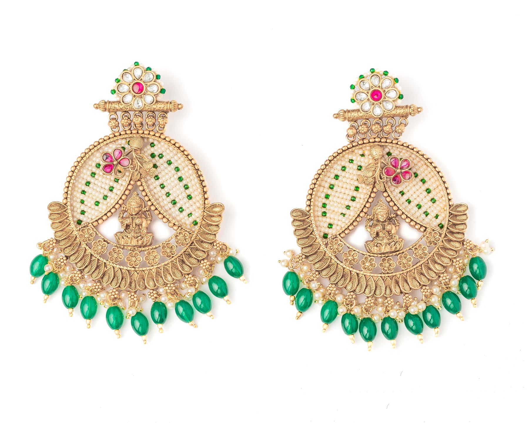 Traditional Indian earrings with gold-tone detailing, featuring a deity figure, floral motifs, pearl-like beads, green drops, and pink accents, offering a vibrant, intricate, and elegant design.L - 10cm, W - 7cm