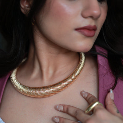 Almost all women today, regardless of age group, find necklaces appealing. It has long been one of the most popular pieces of jewellery for women and a representation of riches and power. The Choker necklace represents elegance, sophistication, richness, and class. Women of all ages wear a variety of choker necklace design, for any particular occasion like wedding day, mother's day, attending a party, festivities or any other occasion. The design of these chokers is based upon traditional components. These chokers contain traditional ethnic components like yellow gold, oxidised silver, ghungroo, kundan, moti, etc. At festive occasions and important events like weddings, these can be paired with a variety of ethnic clothes.