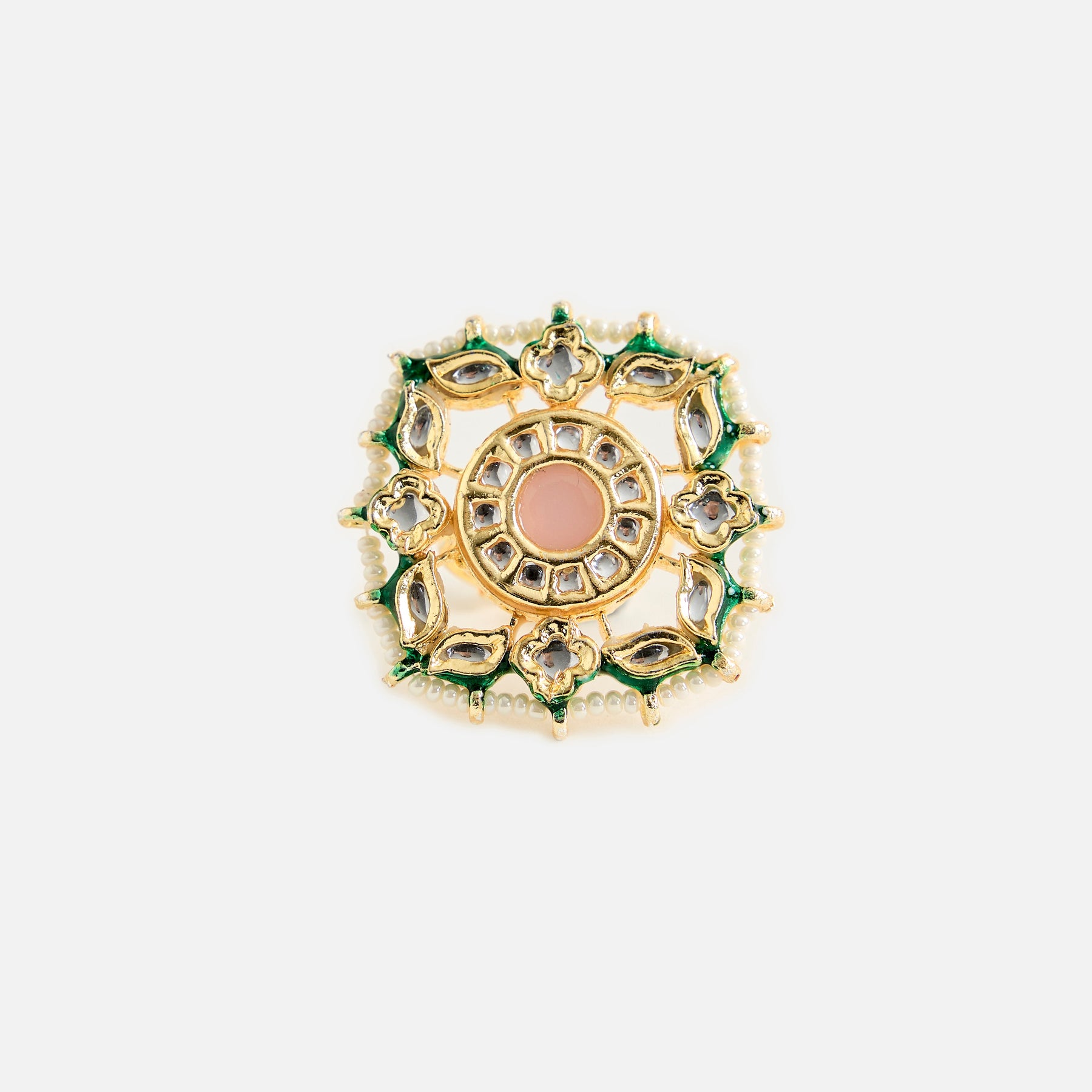 Elegant pearl and kundan statement ring with a floral-inspired design, featuring shimmering stones and intricate detailing. Adjustable fit makes it a perfect accessory for weddings and festive occasions.