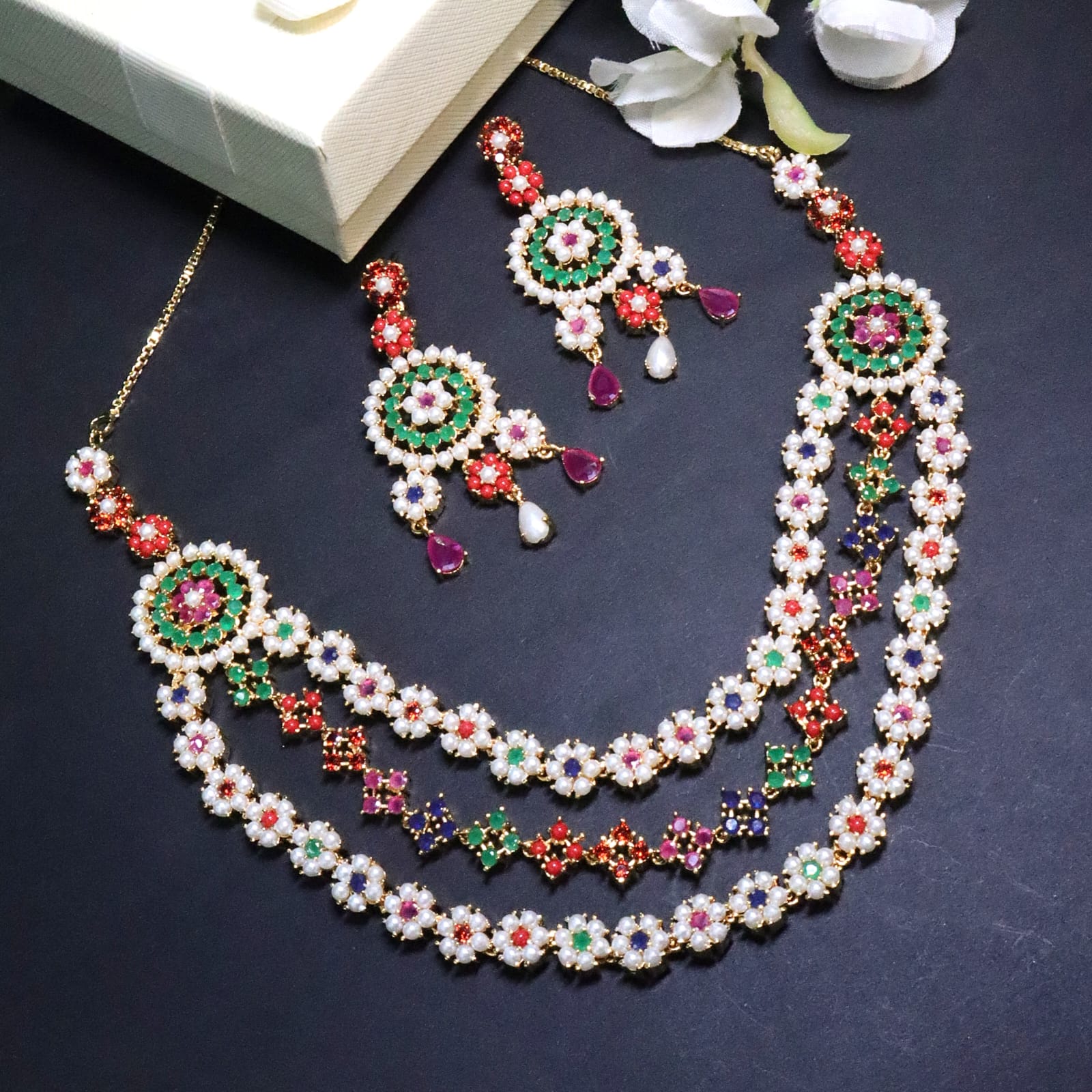 This collection features breathtaking choker necklaces designed to instantly elevate any look. Each piece is a masterpiece, combining shimmering Polki (uncut) stones, Mother of Pearl, and rich, colorful gems like deep emeralds and rubies. Secured with elegant multi-strand pearl or beaded chains, these sets are finished with exquisite cascading pearl drops, ensuring you feel like royalty at every wedding or festive event.
