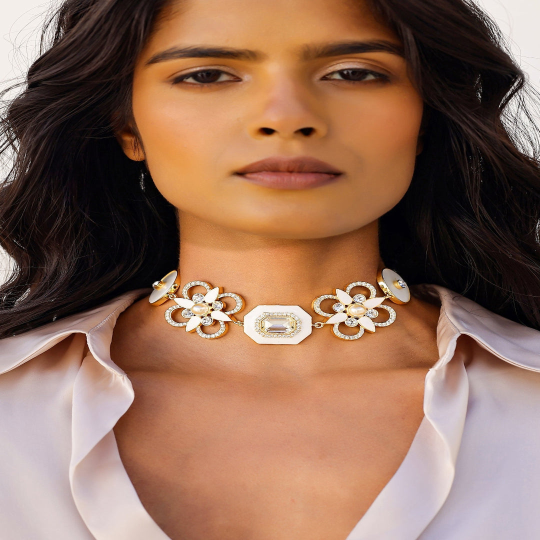 A beautiful choker with swarovski crystals, cubiczirconia, pearls and white enamel, finished with 22kt gold polish