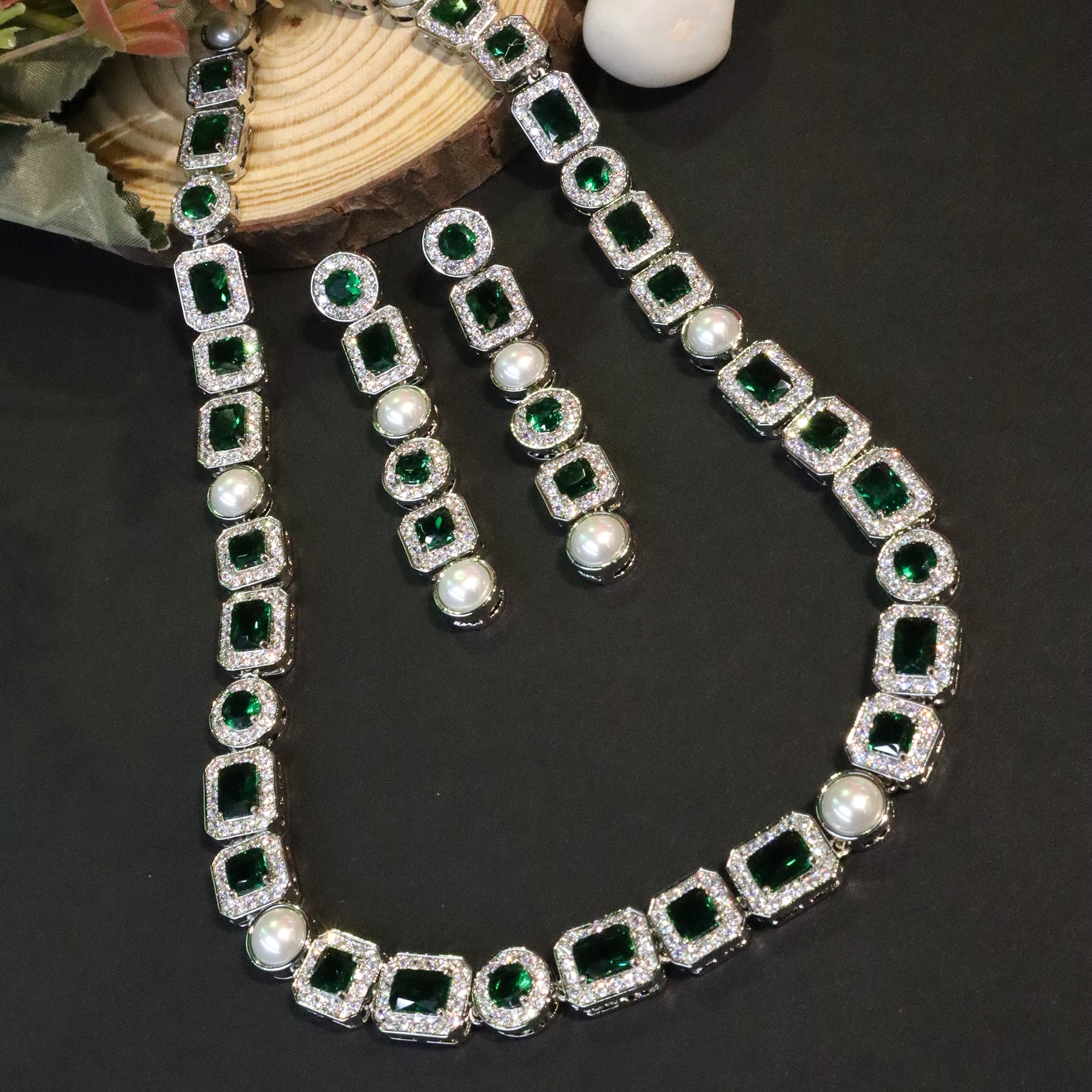White Cubic Zirconia and Pearl Green Long Necklace Set - SIA456097