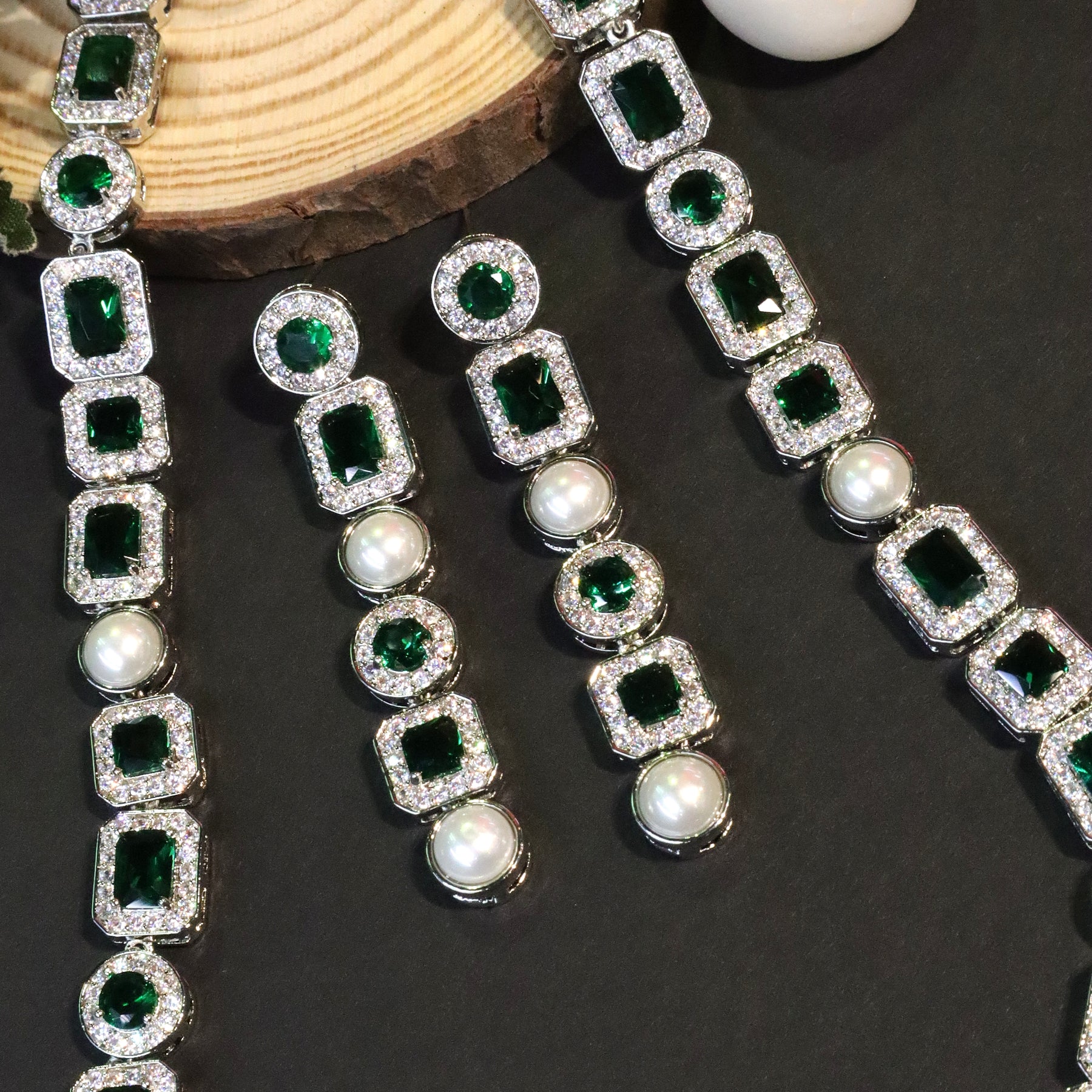 This is a beautiful collection of jewelry, featuring diverse necklace and earring sets that perfectly blend classic elegance with modern flair. You'll find everything from luxurious long necklaces to stylish chokers. A signature look across the collection involves combining brilliant pearls with dazzling white cubic zirconia stones. These are often accented by striking, colored simulated gemstones, such as deep emerald green, vibrant amethyst purple, sleek onyx black, or charming pink stones. The designs vary widely: some sets feature a formal, linked style with neat square or rectangular stones, while others, particularly the chokers, boast more elaborate, intricate designs with floral and teardrop settings. For those who prefer a contemporary touch, there are unique statement pieces showcasing bold, abstract patterns like bi-color metallic bars or chunky, multi-colored stones, including trendy druzy accents. Each piece is crafted for a luxurious, high-luster finish, making these sets ideal for bridal wear, formal events, or adding a touch of glamour to any special occasion.