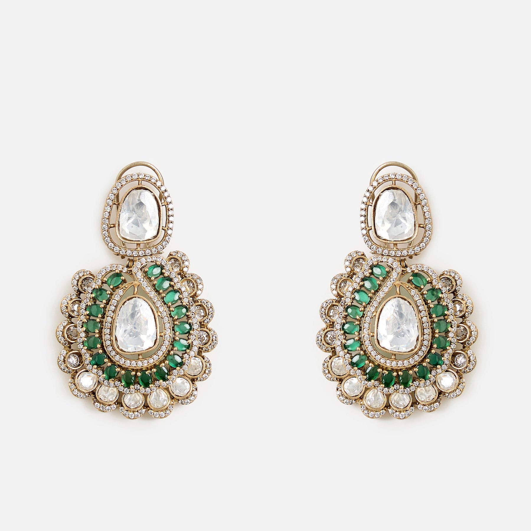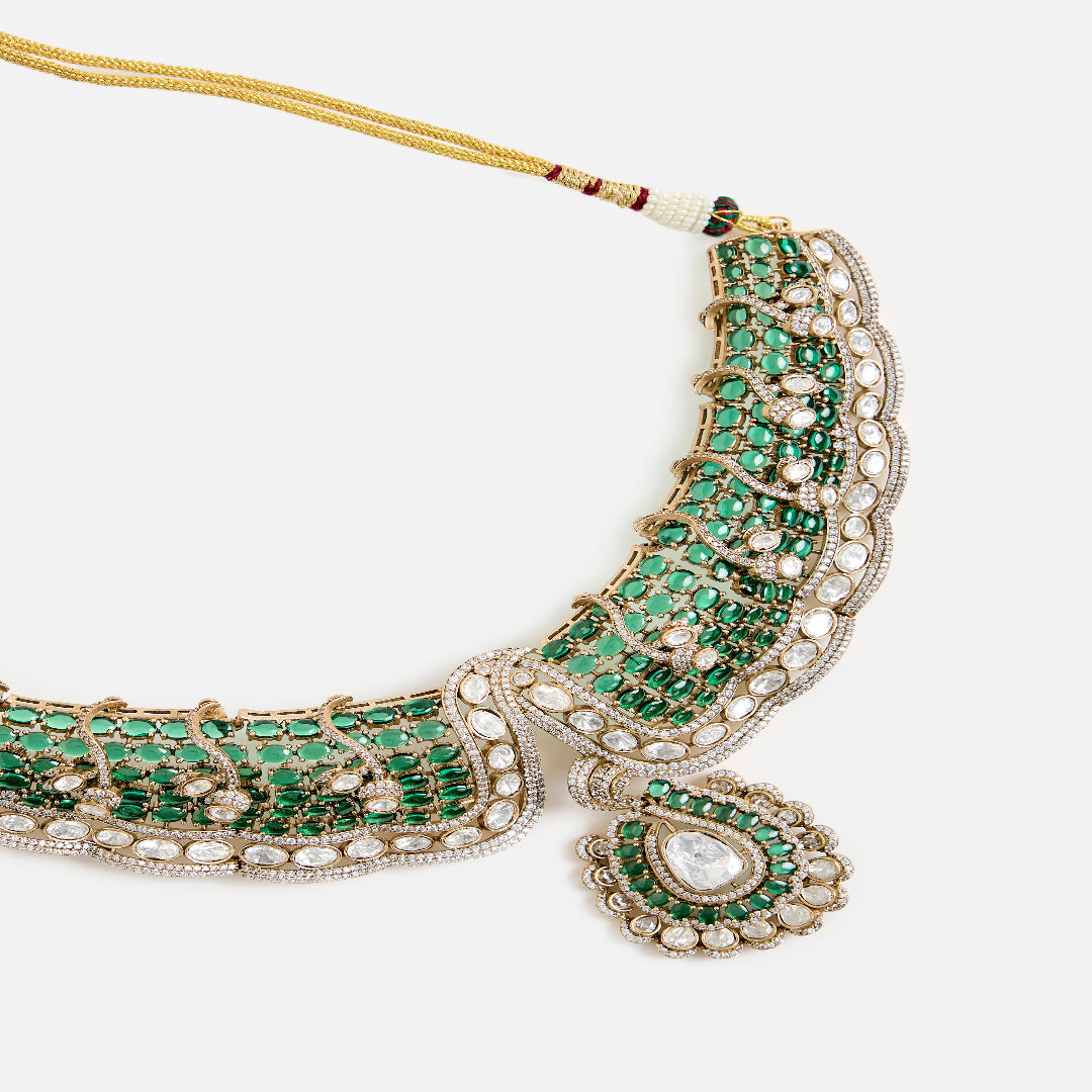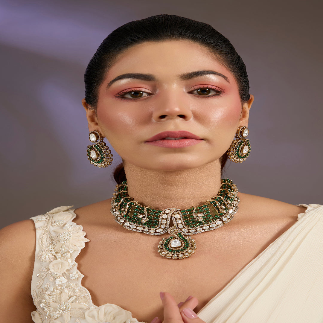 This elegant green kundan choker set with matching earrings showcases intricate craftsmanship, dazzling stones, and regal charm, making it the perfect choice for weddings and festive occasions.