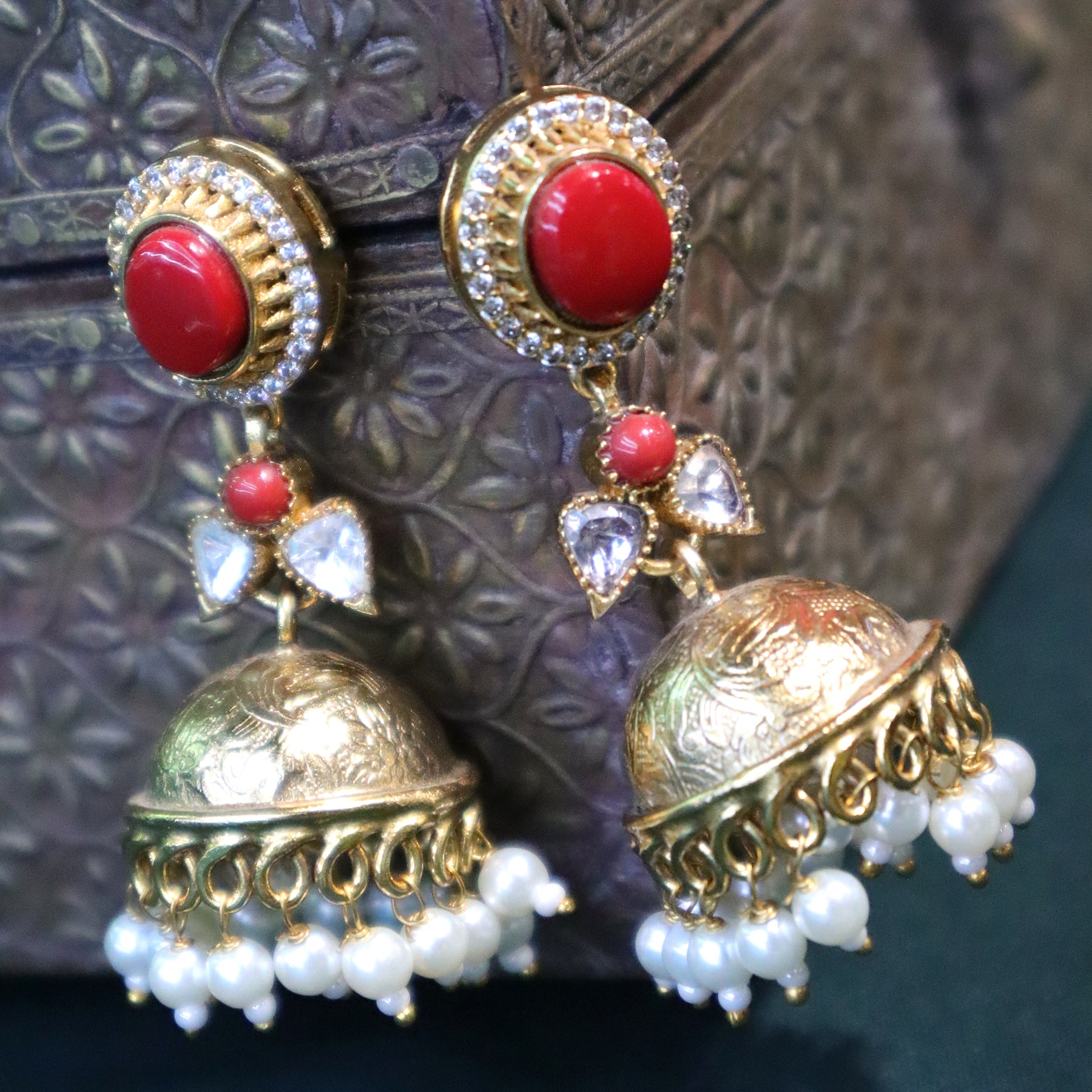 Coral and CZ Studded Jhumka Earrings - SIA444175
