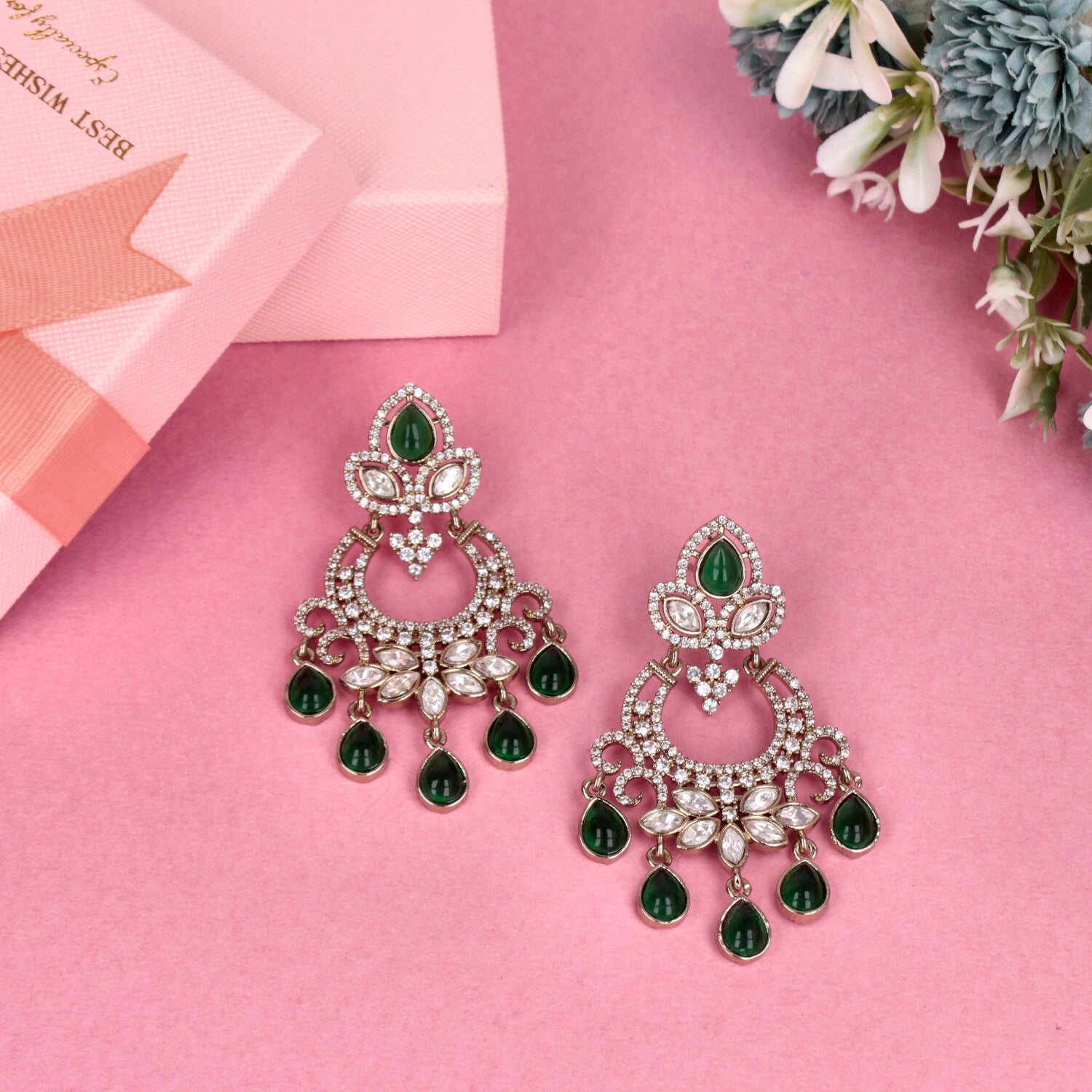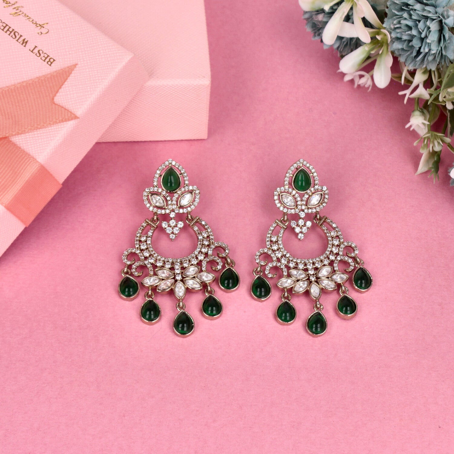 Stunning Silver Toned Green Stone and CZ Chandbali Earrings - SIA441231