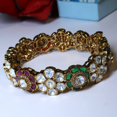 Gold Floral Kundan Bangle with Multicol...