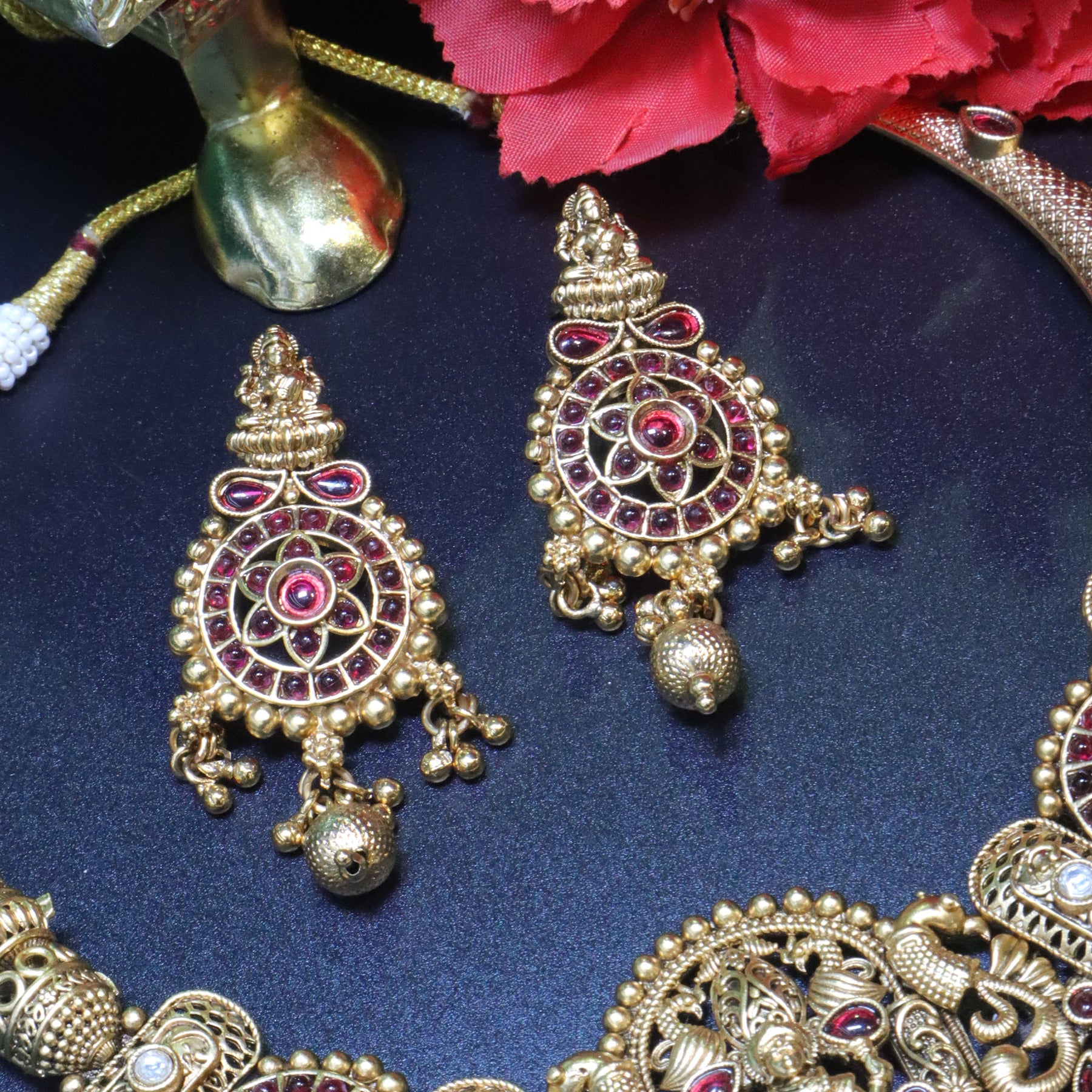 This collection beautifully blends tradition with timeless elegance. Each necklace set glows in rich antique gold, highlighted by delicate ruby accents and divine motifs that tell a story of grace and heritage. The intricate designs — from elegant paisleys to goddess-inspired pendants — bring a regal charm to every look. Perfect for festive moments or bridal celebrations, these pieces are crafted to make you feel truly special.