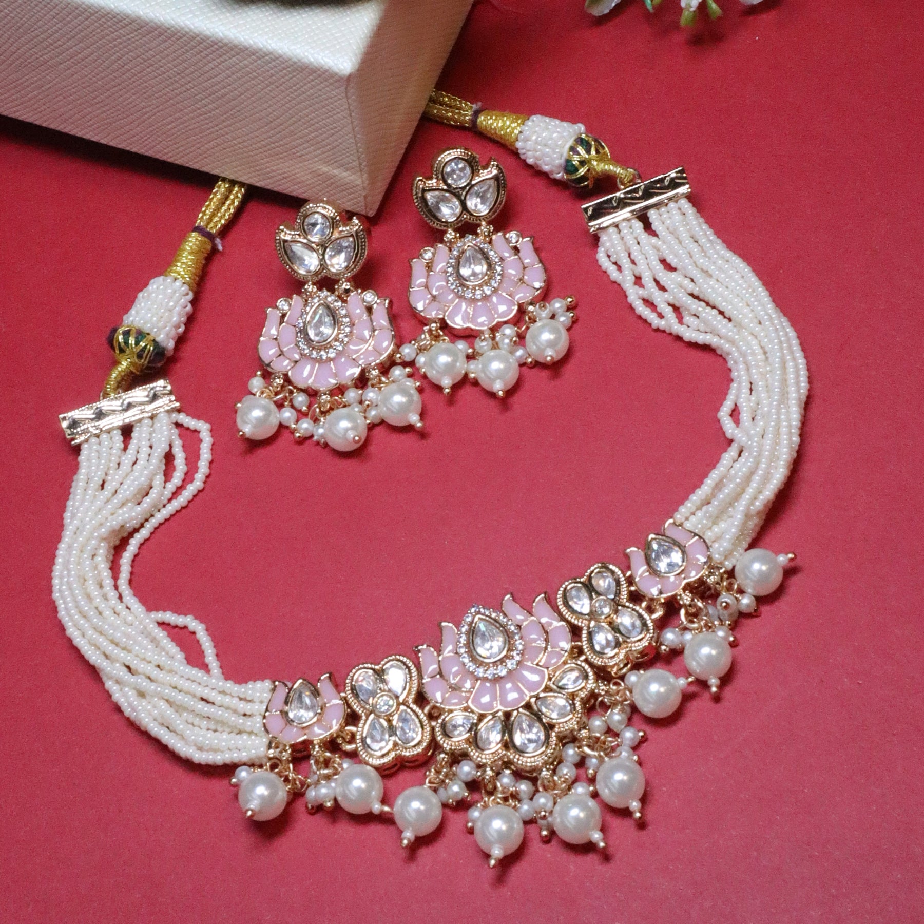 Pink Antique Lotus Motif Choker Set - SIA455691