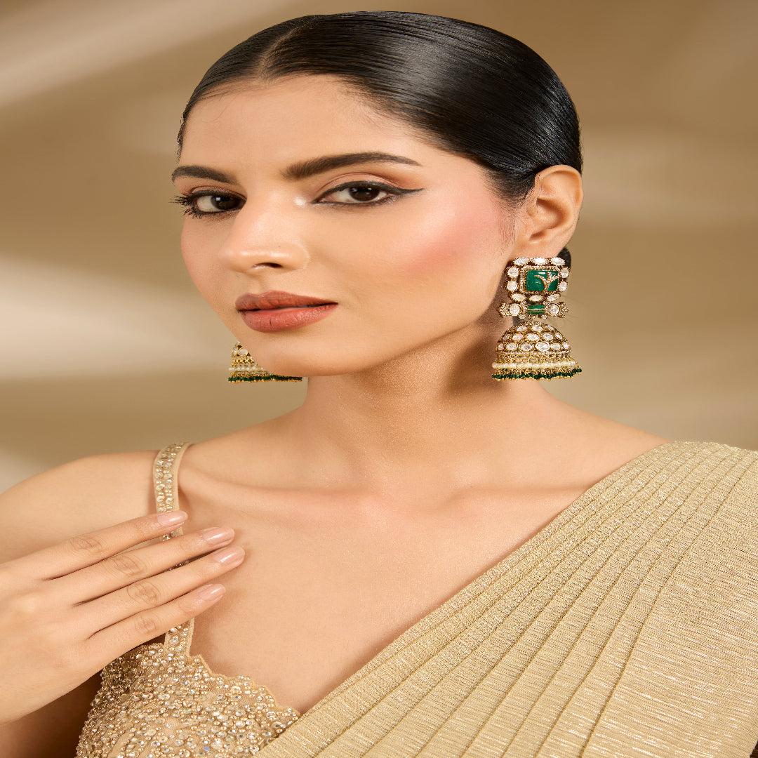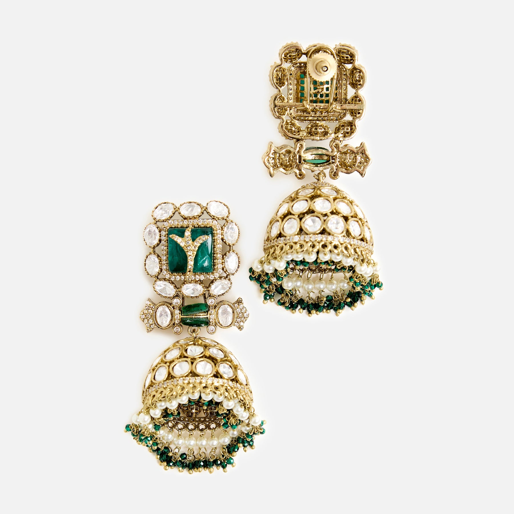 Stunning gold-tone jhumka earrings adorned with green and pink stones, finished with pearl detailing. A perfect statement accessory for weddings, festive occasions, and traditional ensembles.