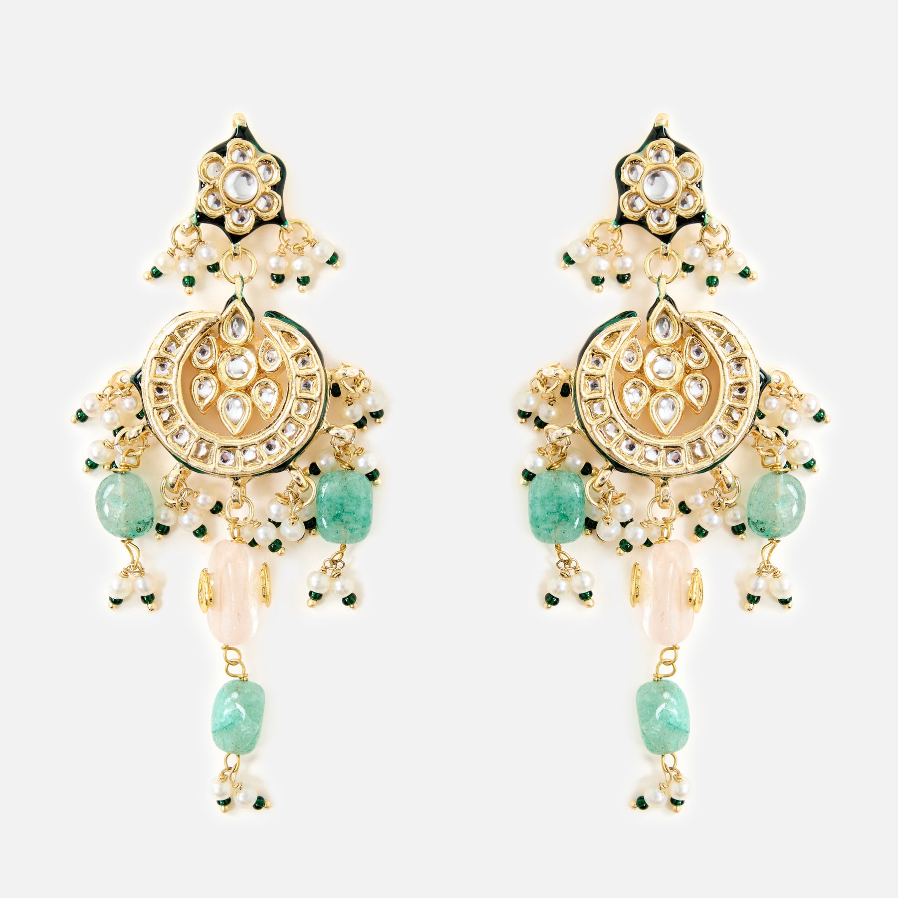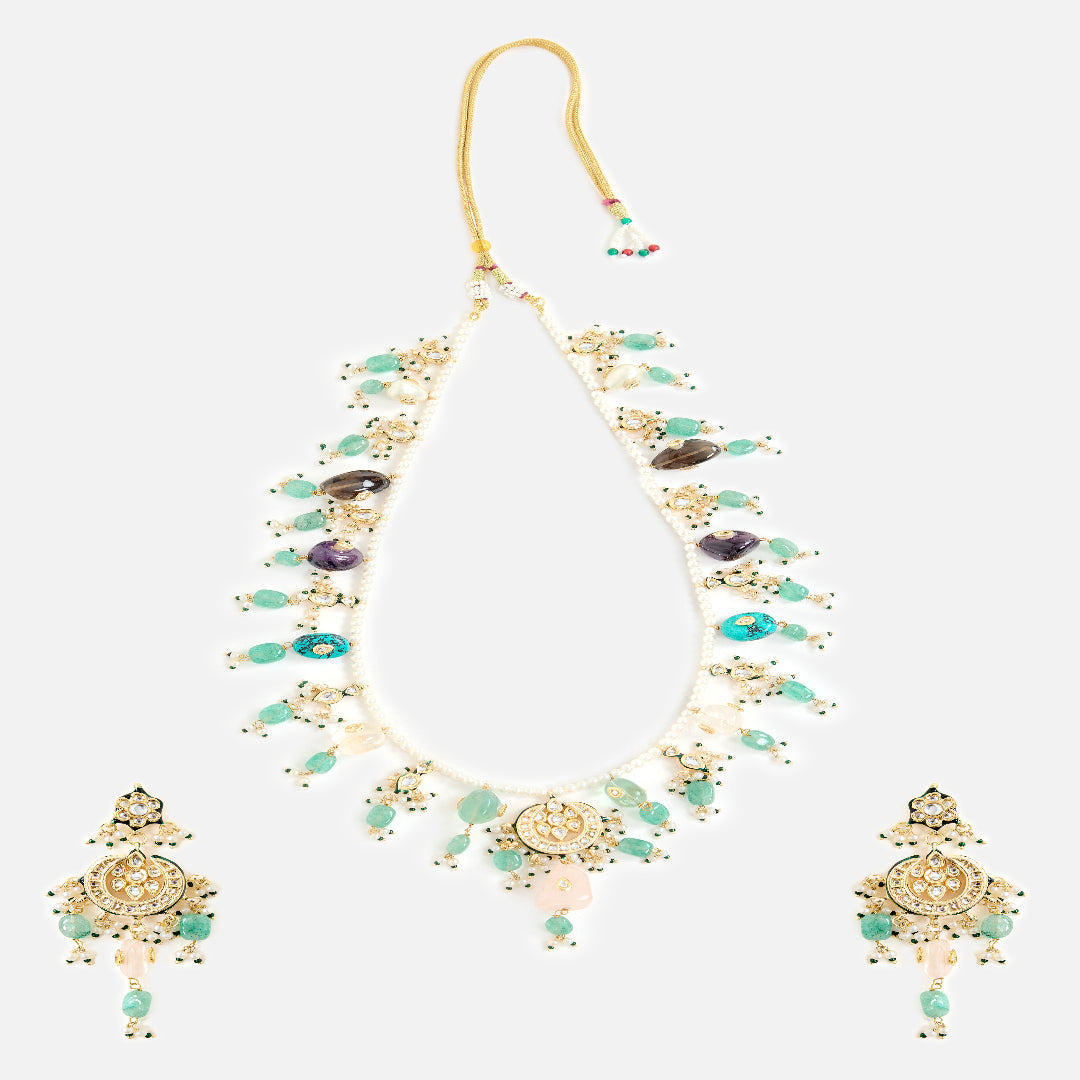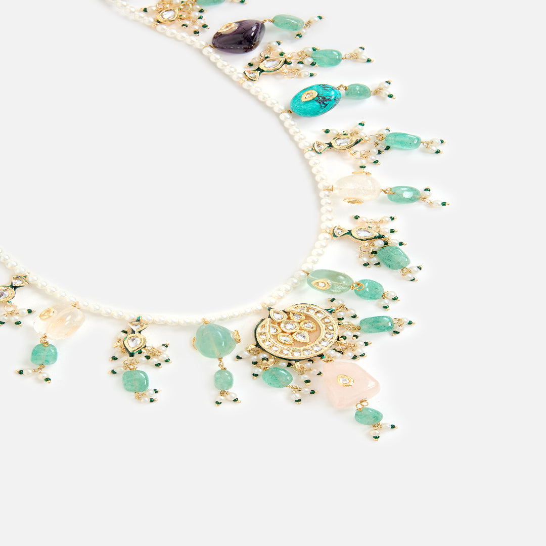 Exquisite layered pearl and gemstone necklace adorned with floral motifs and emerald accents, blending tradition with elegance—perfect for weddings, festive occasions, and grand celebrations.