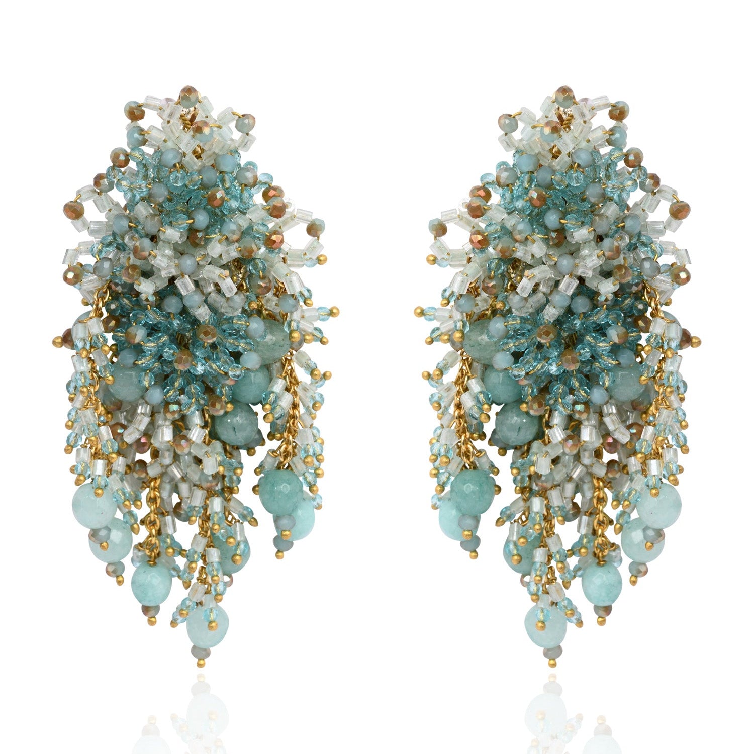 Handcrafted turquoise long earrings featuring cascading beads, crystals, and golden accents. Lightweight yet statement-making, they add a touch of elegance to festive, wedding, and party looks. Perfect to style with both traditional and contemporary outfits for a striking finish.
