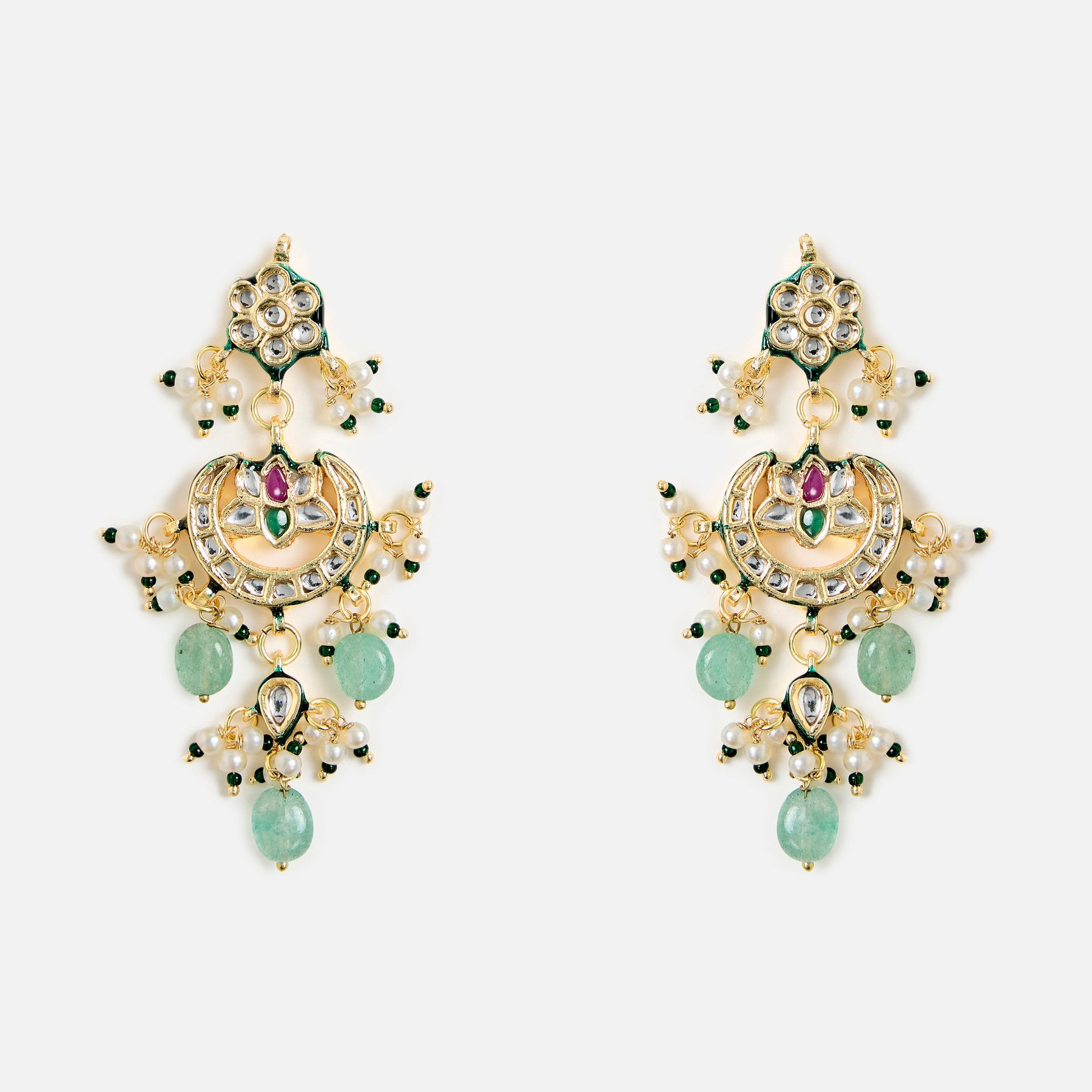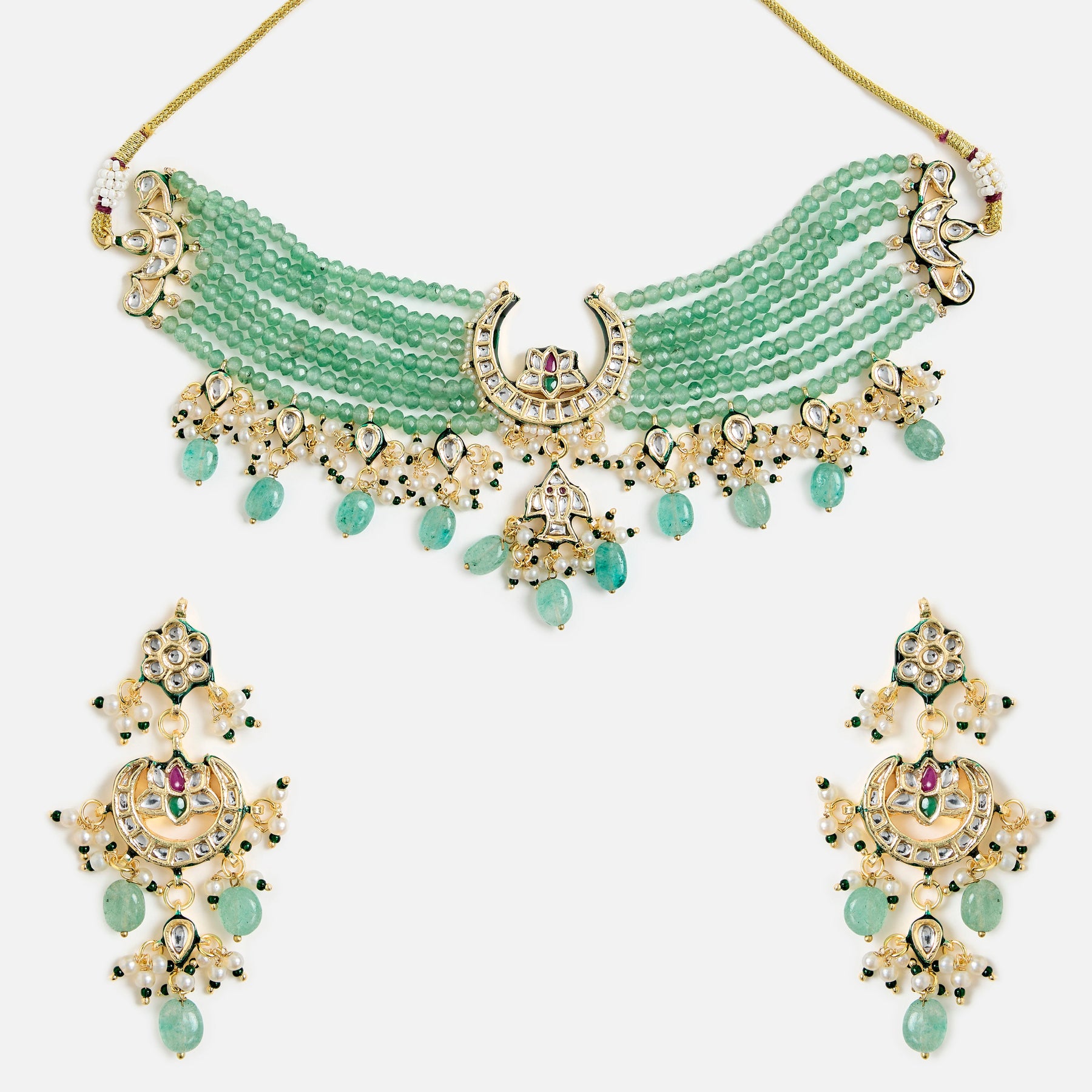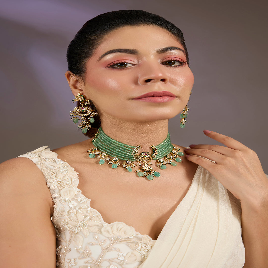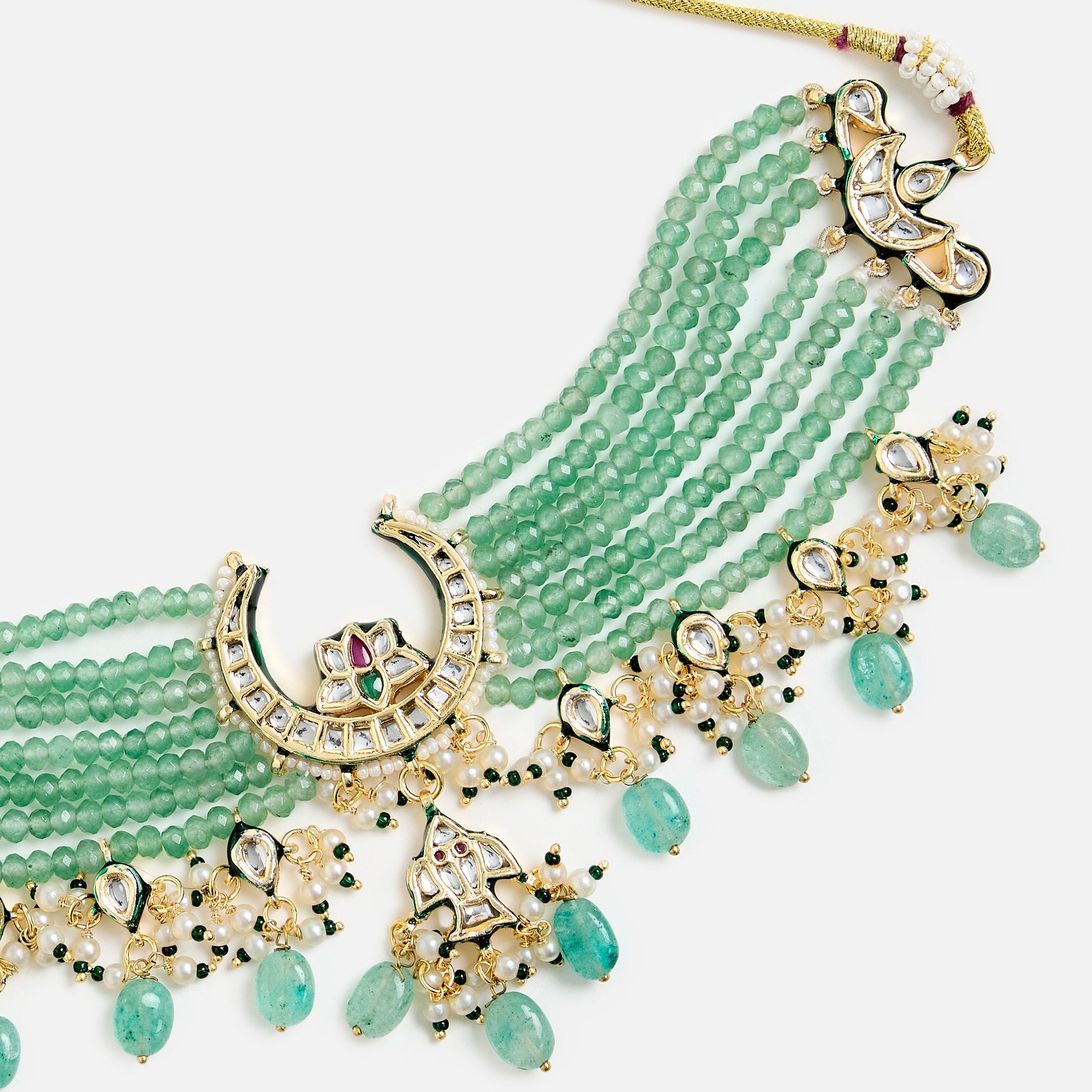 Exquisite green beaded kundan choker necklace with pearl drops and floral centerpiece. A statement piece that adds regal elegance, perfect for weddings, festive occasions, and traditional attire.