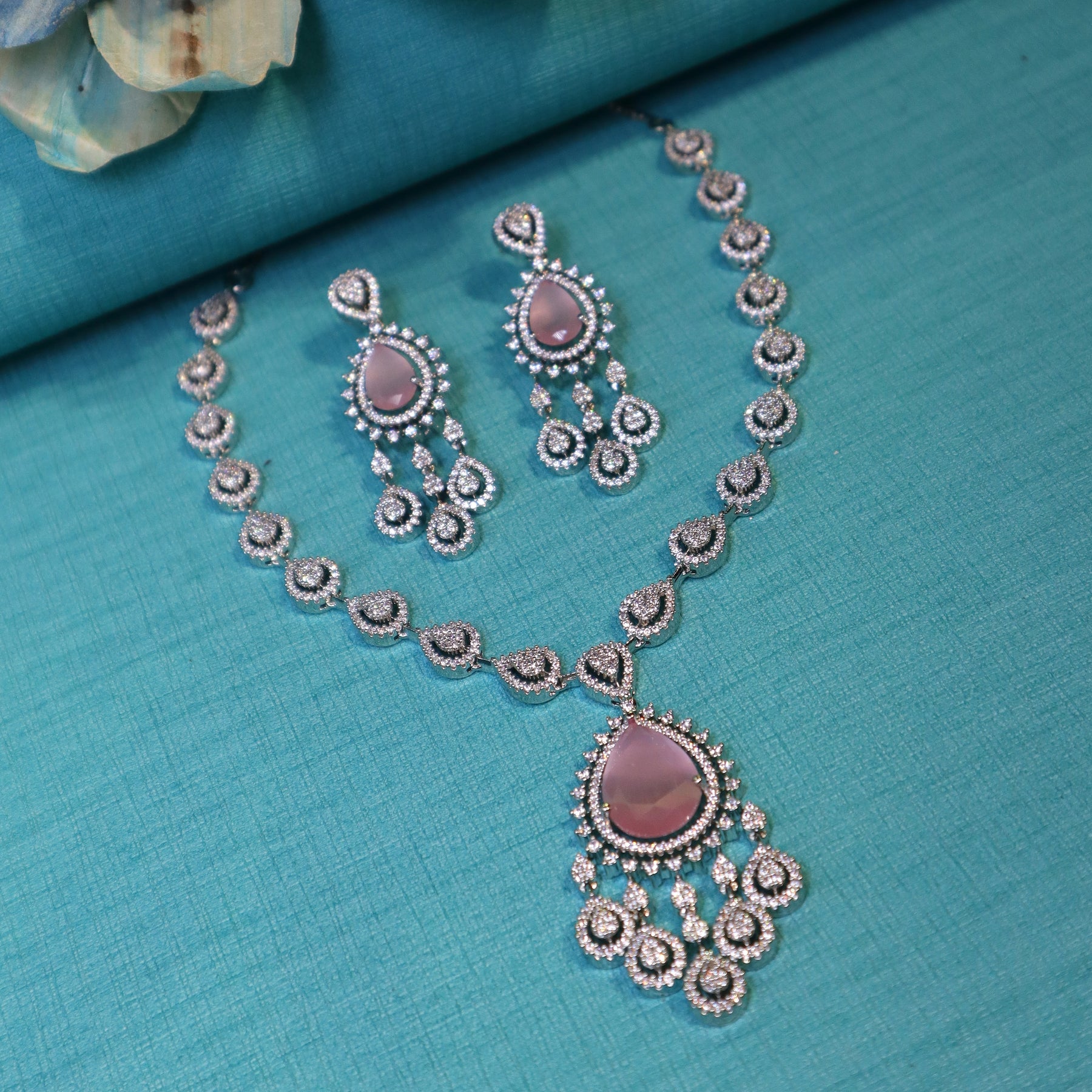 Rhodium-Plated Pink CZ &Teardrop Necklace set - SIA452337