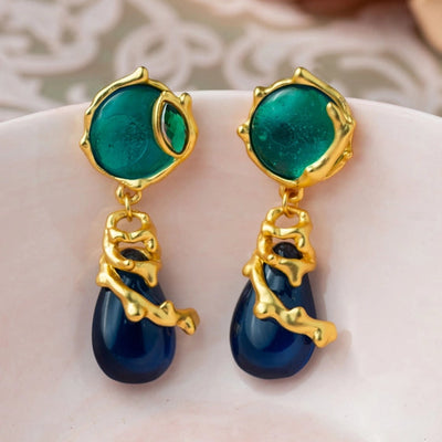 Green Round Earrings with Deep Blue and...