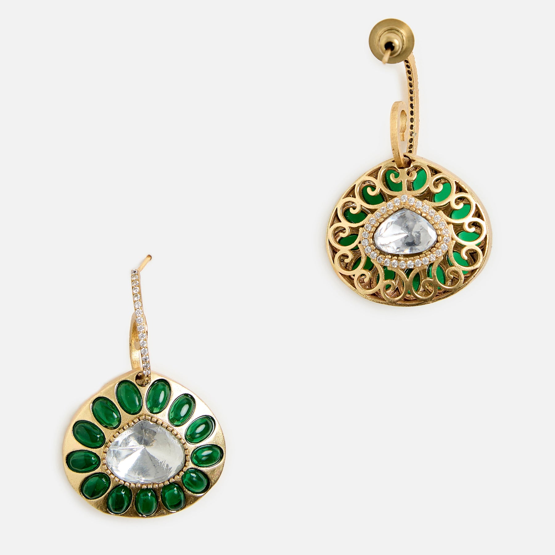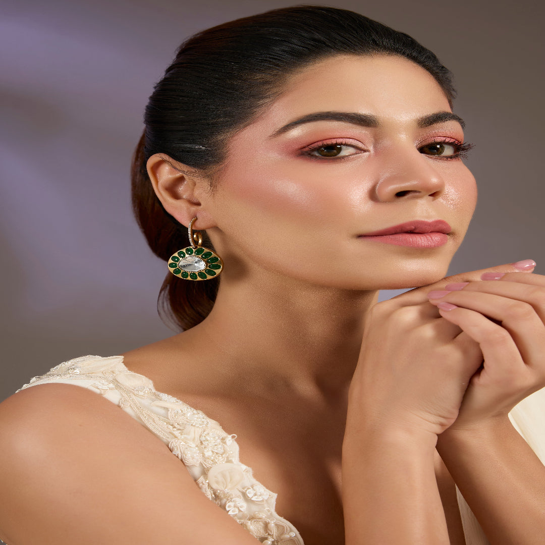Elegant Emerald Green Round Drop Earrings crafted with sparkling stones and a striking green centerpiece. Perfect to pair with traditional or modern outfits for weddings, parties, or festive occasions.