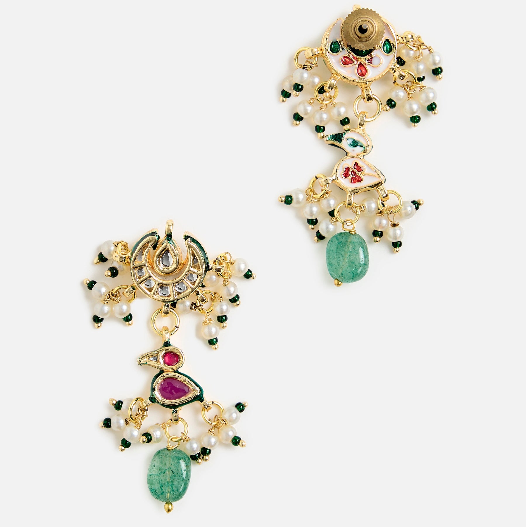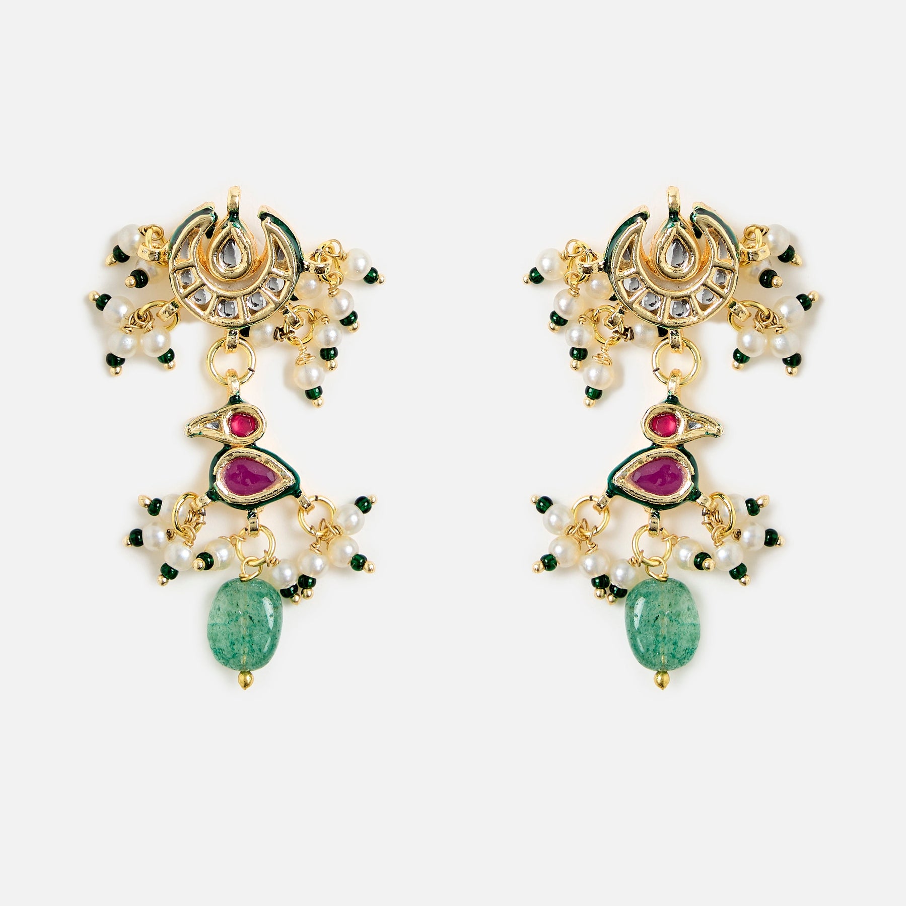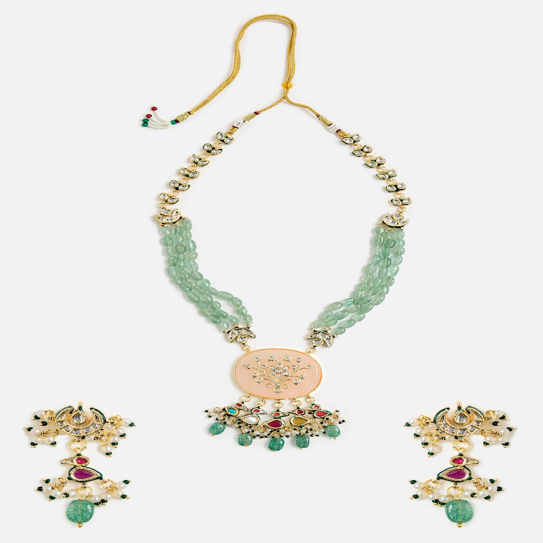 A statement green beaded kundan choker set with floral motifs and dangling drops, paired with matching earrings. Perfect for weddings, festive occasions, and elegant soirées.