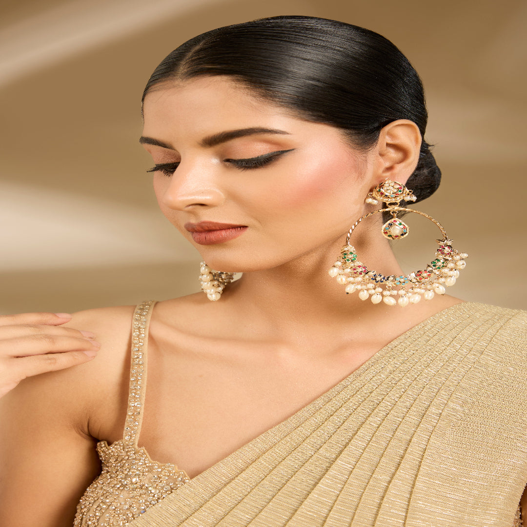Elegant oversized chandbali earrings with intricate detailing, embellished with stones and pearl drops. A perfect statement piece for weddings, festive celebrations, and traditional occasions.