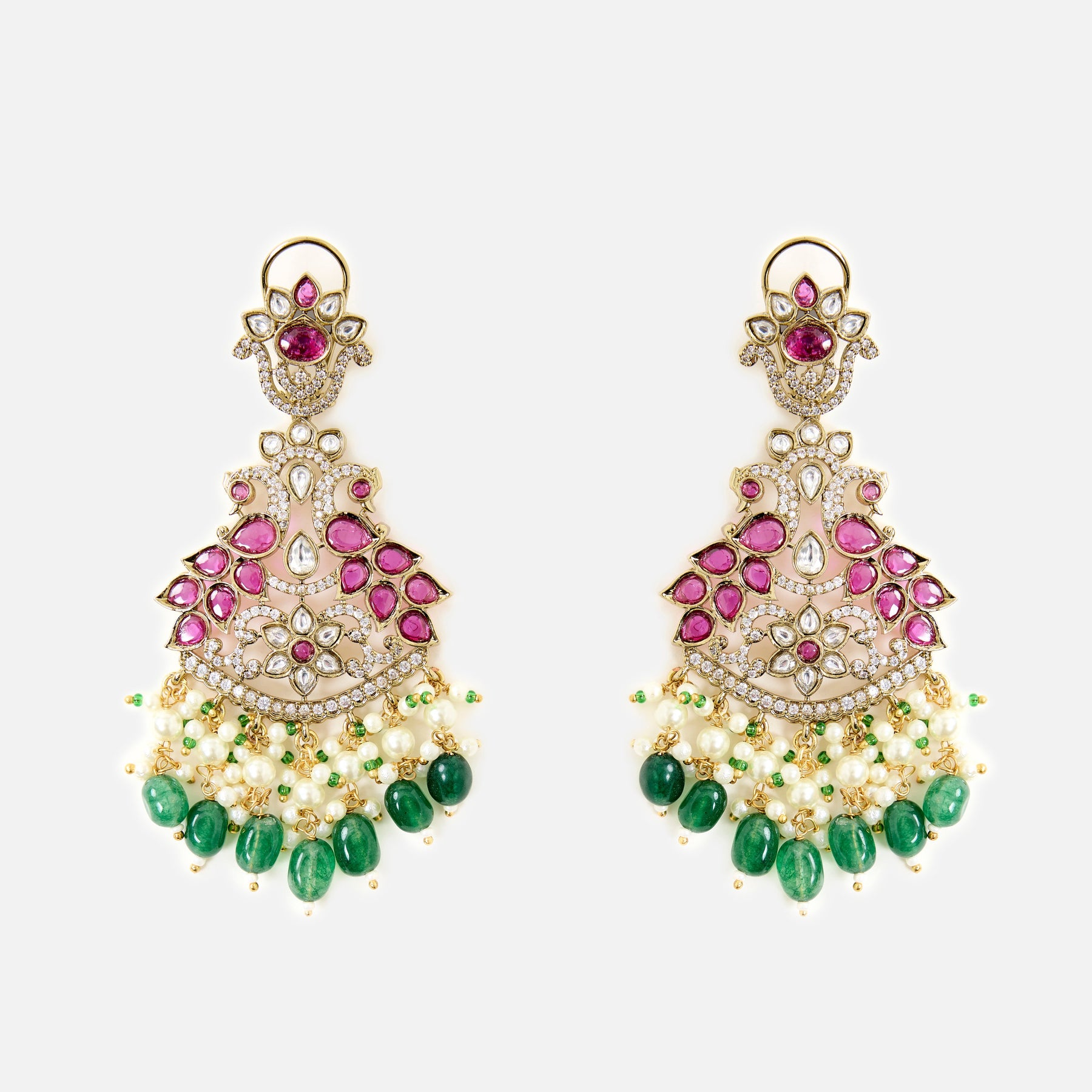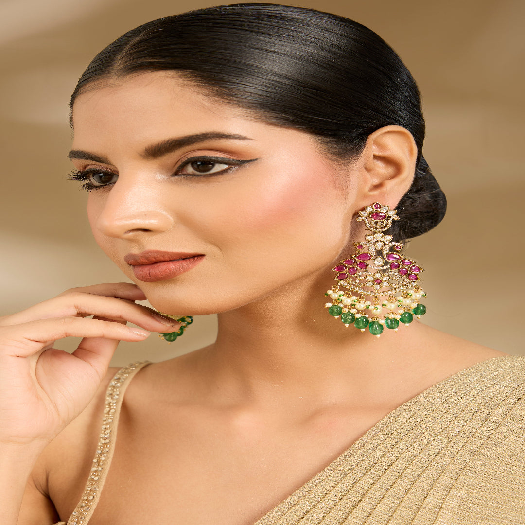 Exquisite chandelier earrings featuring ruby-toned stones, pearl drops, and emerald green beads. A regal statement piece perfect for weddings, festive occasions, and evening celebrations.