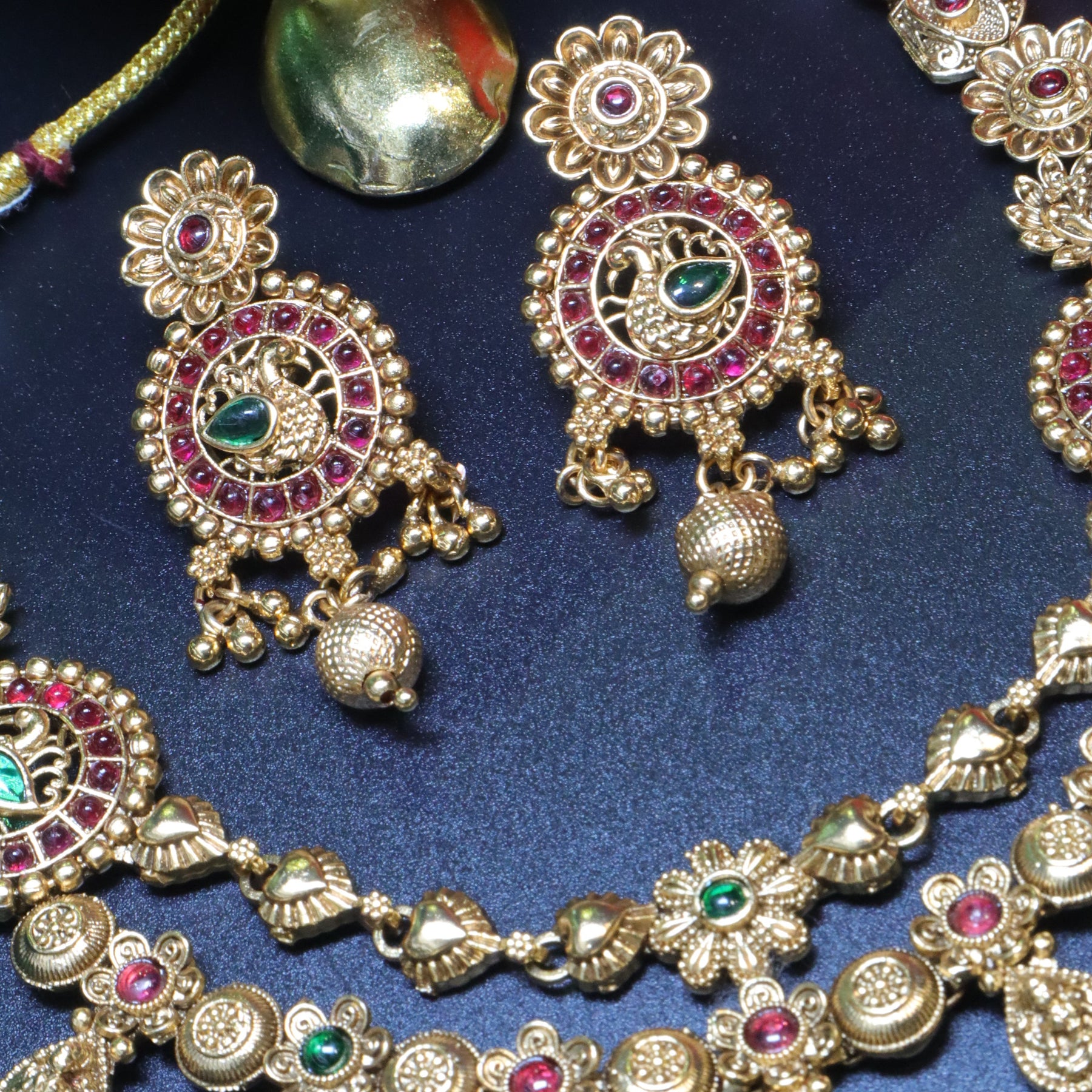 This collection beautifully blends tradition with timeless elegance. Each necklace set glows in rich antique gold, highlighted by delicate ruby accents and divine motifs that tell a story of grace and heritage. The intricate designs — from elegant paisleys to goddess-inspired pendants — bring a regal charm to every look. Perfect for festive moments or bridal celebrations, these pieces are crafted to make you feel truly special.