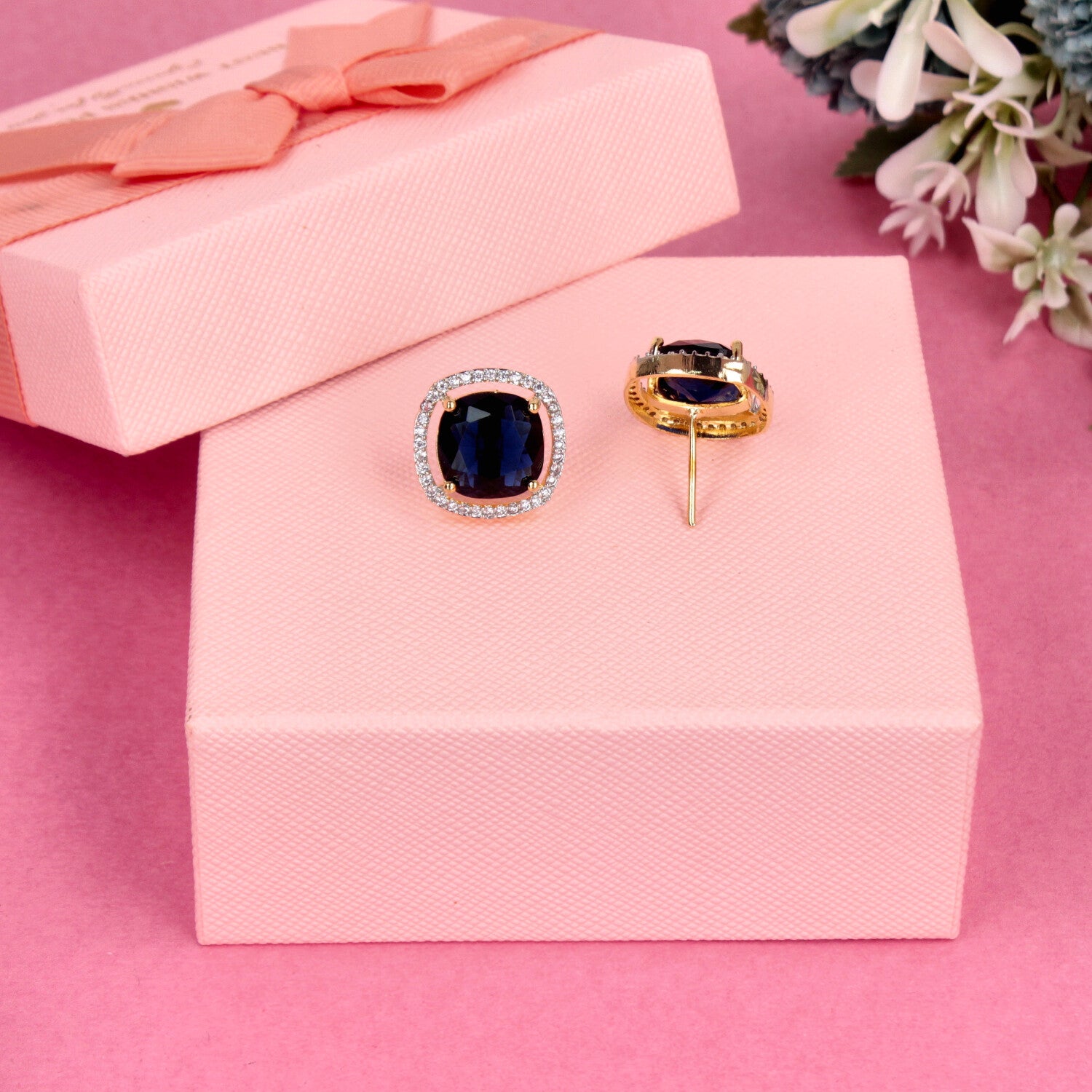 These elegant stud earrings feature a beautiful square-cut gemstone at the center. Surrounding the deep purple stone is a sparkling border of small white crystals. The earrings are set in a warm gold-tone base for a classic and polished look. They are displayed on a light pink textured gift box, making them a perfect present. Their simple yet sophisticated design makes them suitable for both daily wear and special occasions.