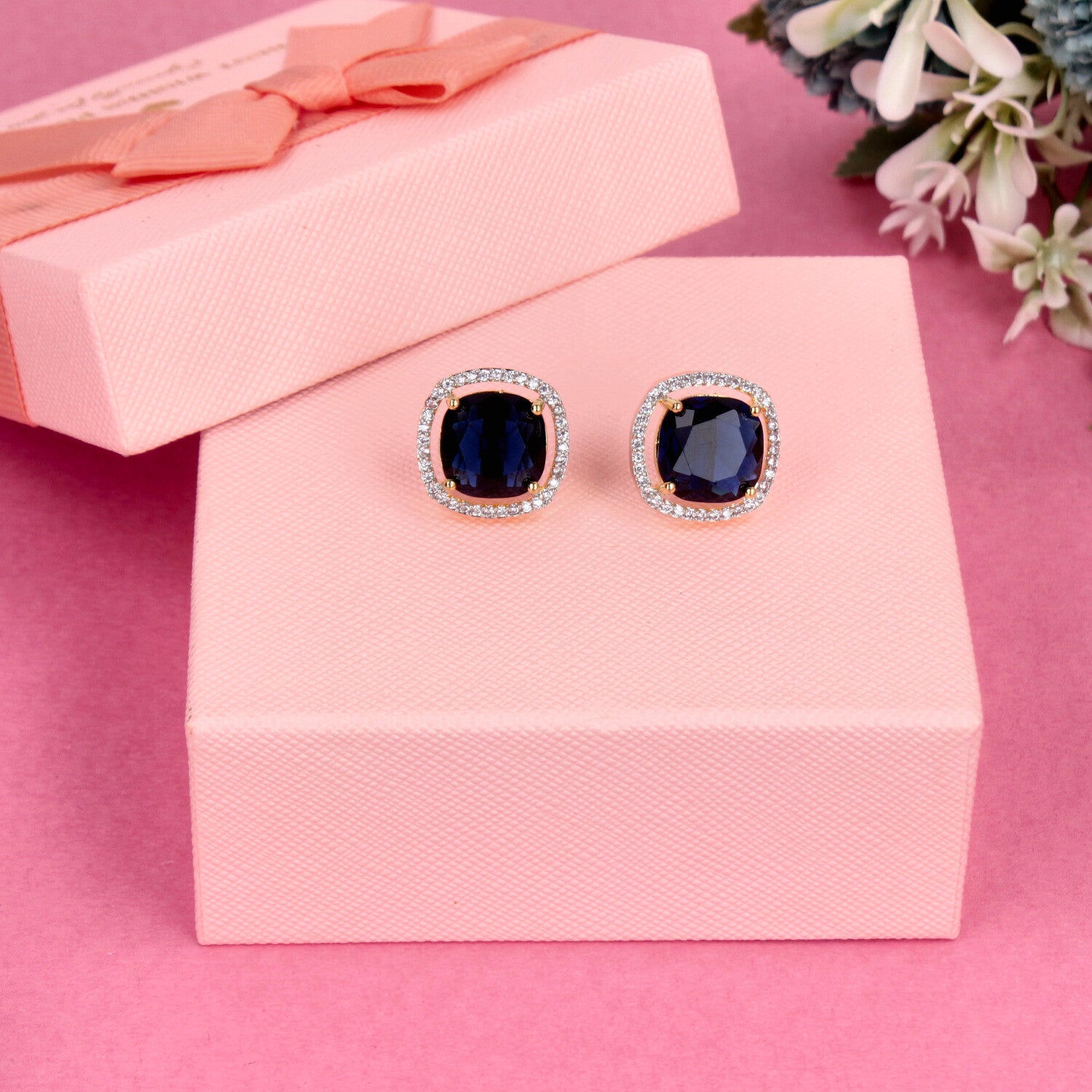 Blue Square Gemstone Stud Earrings with Sparkling Border - SIA459669