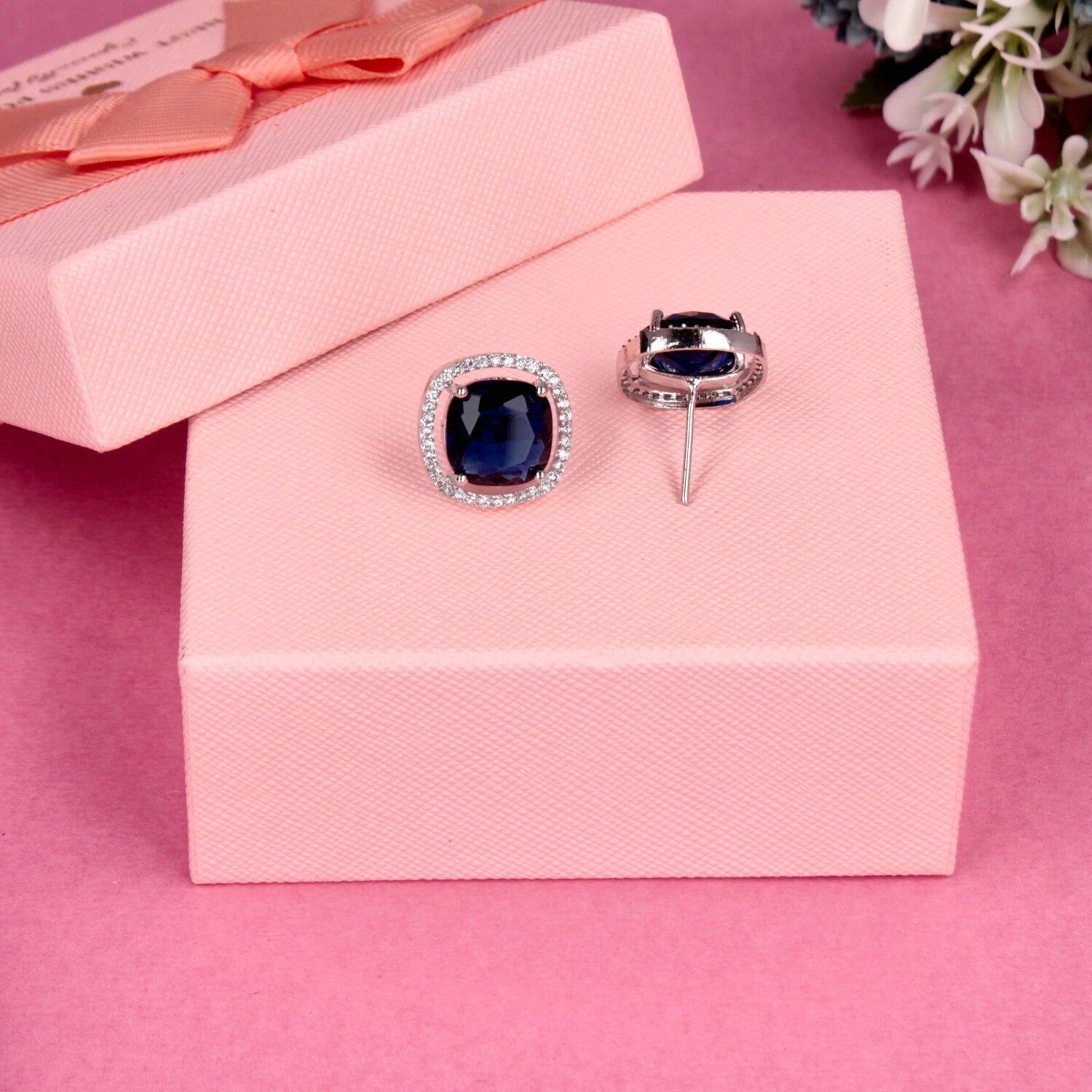 Blue Square Gemstone Stud Earrings with Sparkling Border - SIA459677