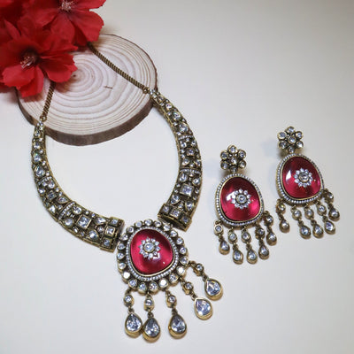 This collection is all about regal color and sparkle, featuring bold Kundan and Polki chokers set in an antique finish. Choose your statement vibrant enamel work (Meenakari) in rich colors like deep blue and maroon, or elegant necklaces with large, smooth colored stones (Aqua, Red, or Pink) framed by sparkling clear drops. Perfect for adding a touch of vintage glamour to any festive look."