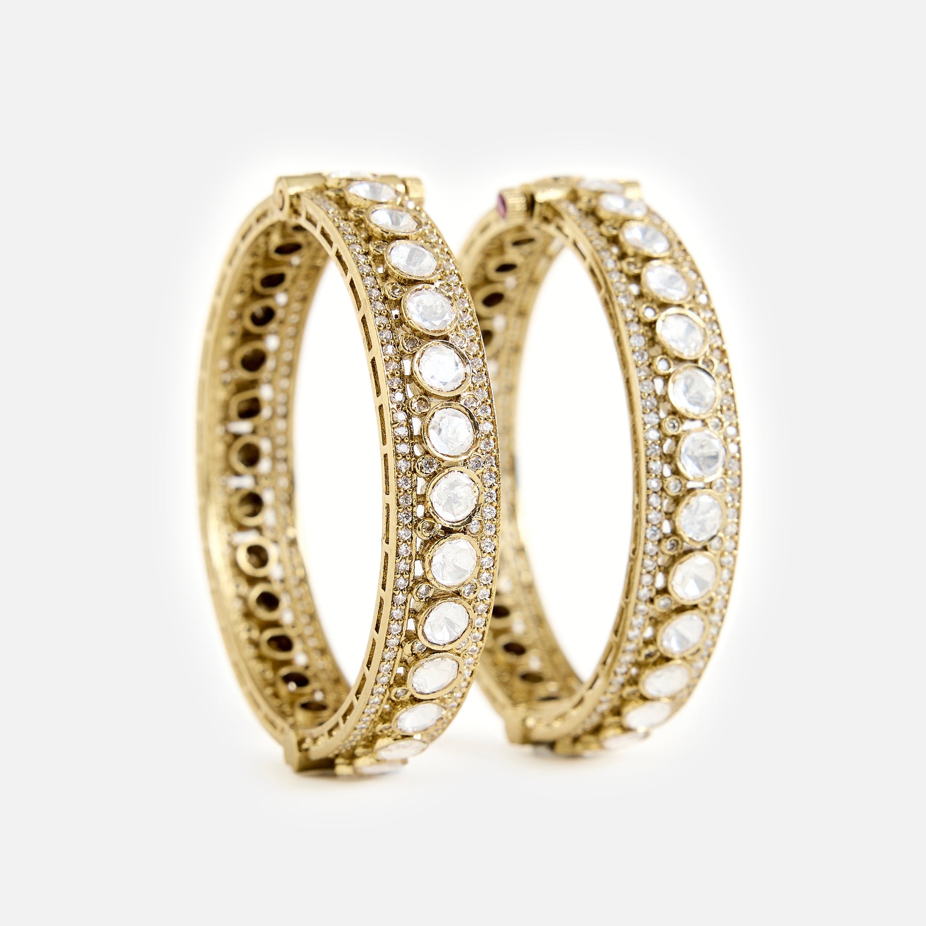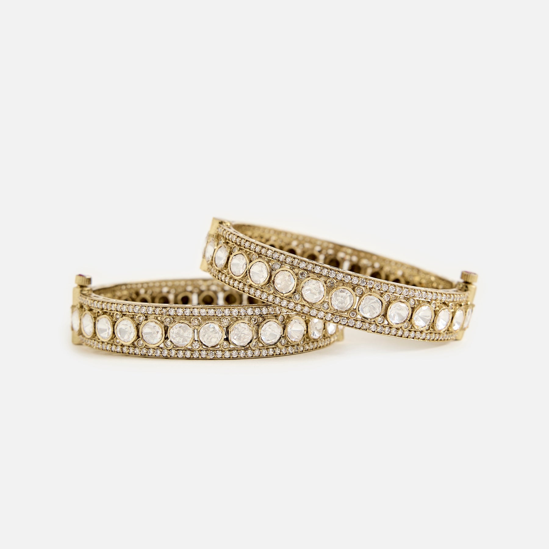Elegant handcrafted gold-toned bangles adorned with sparkling Moissanite Kundan Polki stones and delicate detailing. A perfect blend of tradition and style, ideal for weddings, festive occasions, and celebrations.