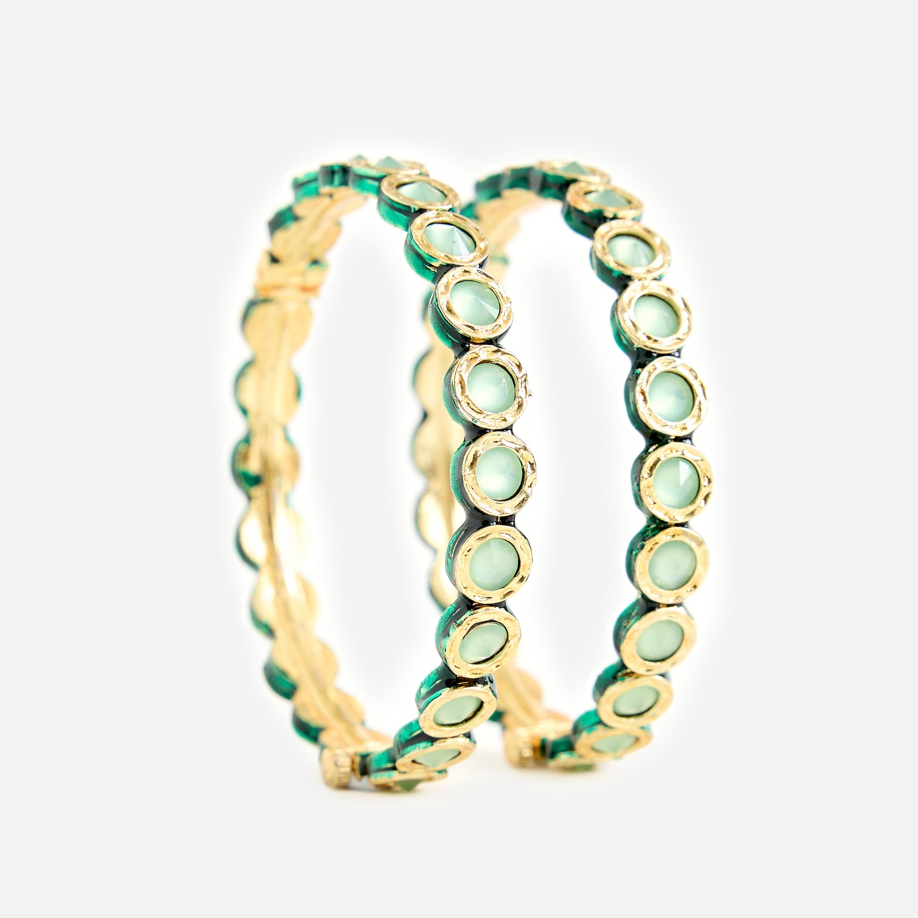Elegant gold-toned bangle set adorned with pastel green stones, perfect for festive occasions or evening wear. Lightweight, stylish, and versatile to pair with both ethnic and modern outfits.