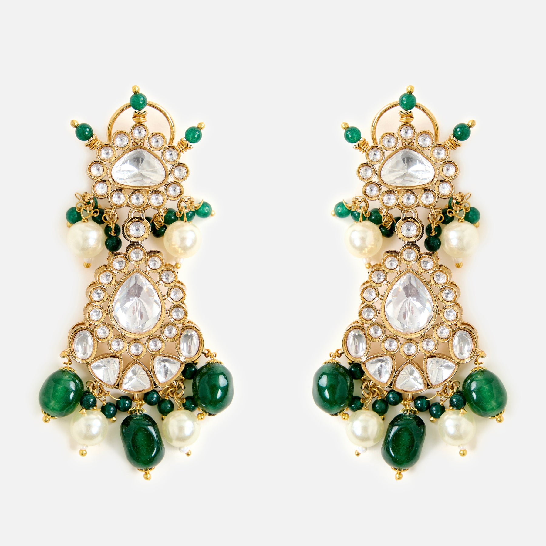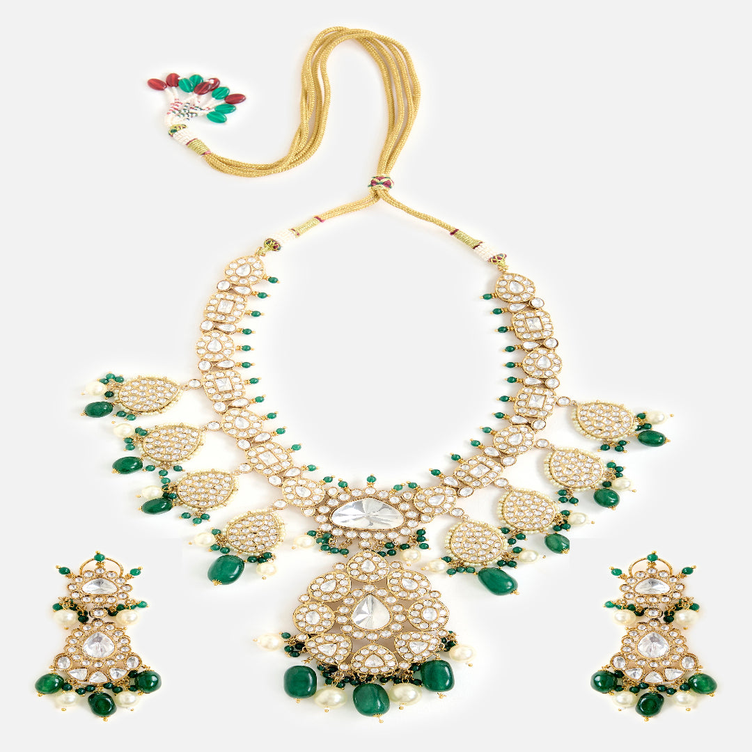 This stunning bridal necklace set features intricate Kundan work with green beads, matching earrings, and maang tikka. Perfect for weddings and festive occasions, it adds regal charm and elegance.