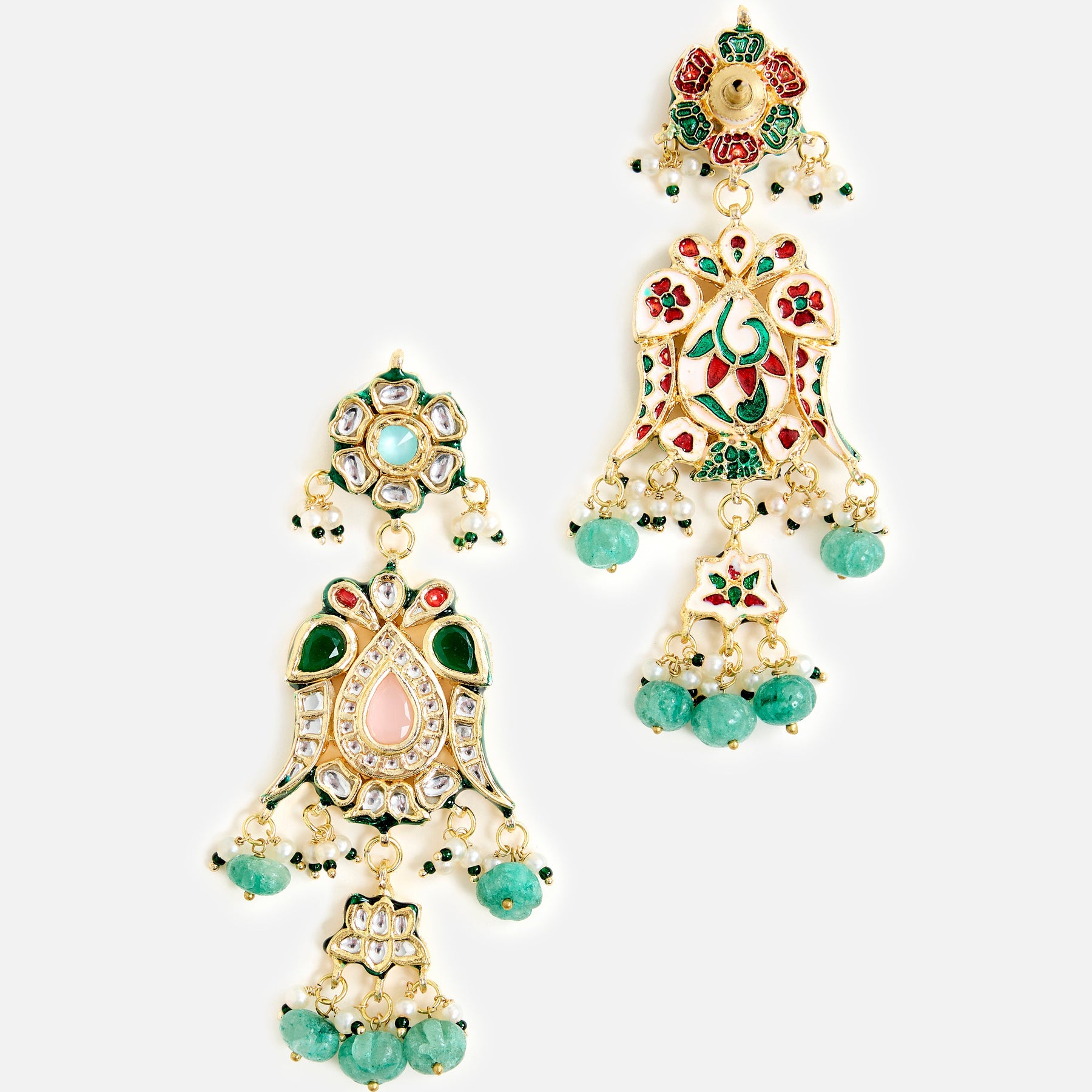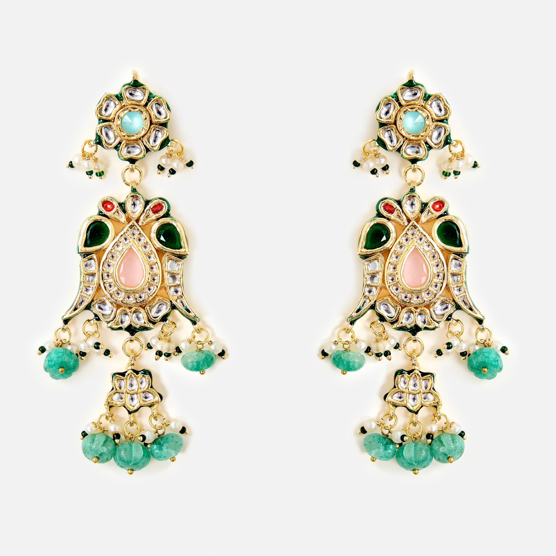 Add regal charm to your look with these gold-plated kundan chandelier earrings, adorned with green bead drops. Perfect for weddings, festive occasions, and statement ethnic styling.