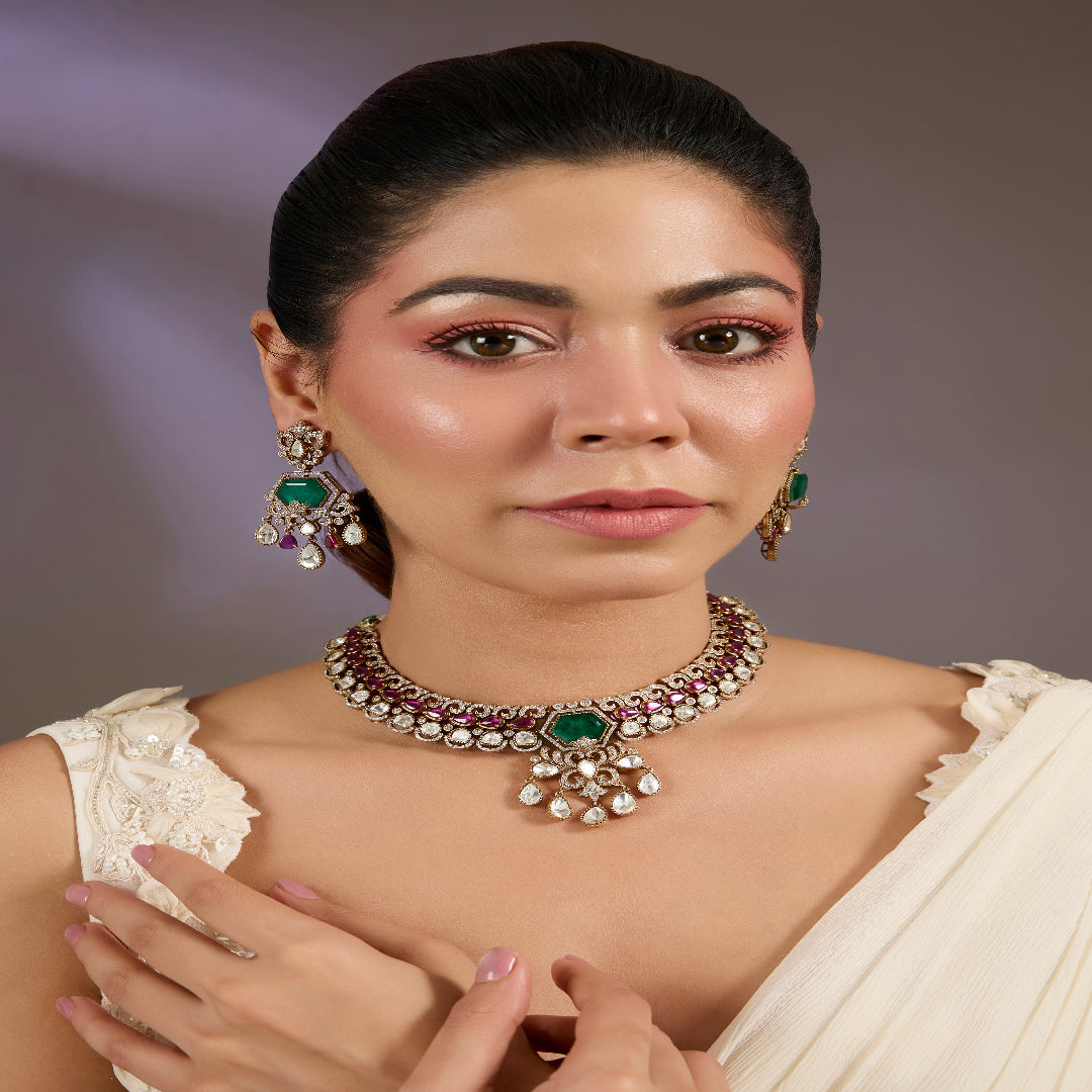 Elegant kundan choker necklace set featuring emerald accents, pearl drops, and matching earrings. Perfect for weddings, festive occasions, or evening celebrations to add regal charm and sophistication.