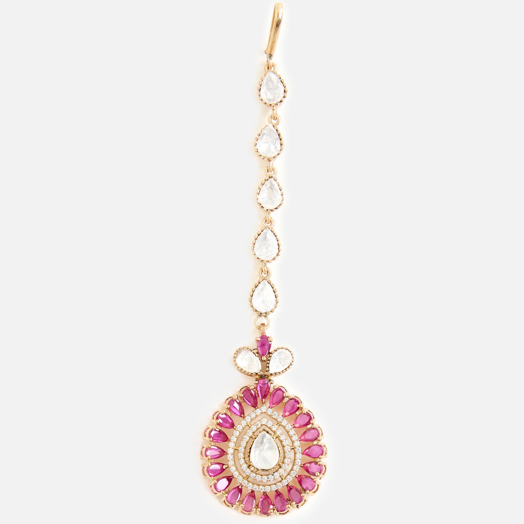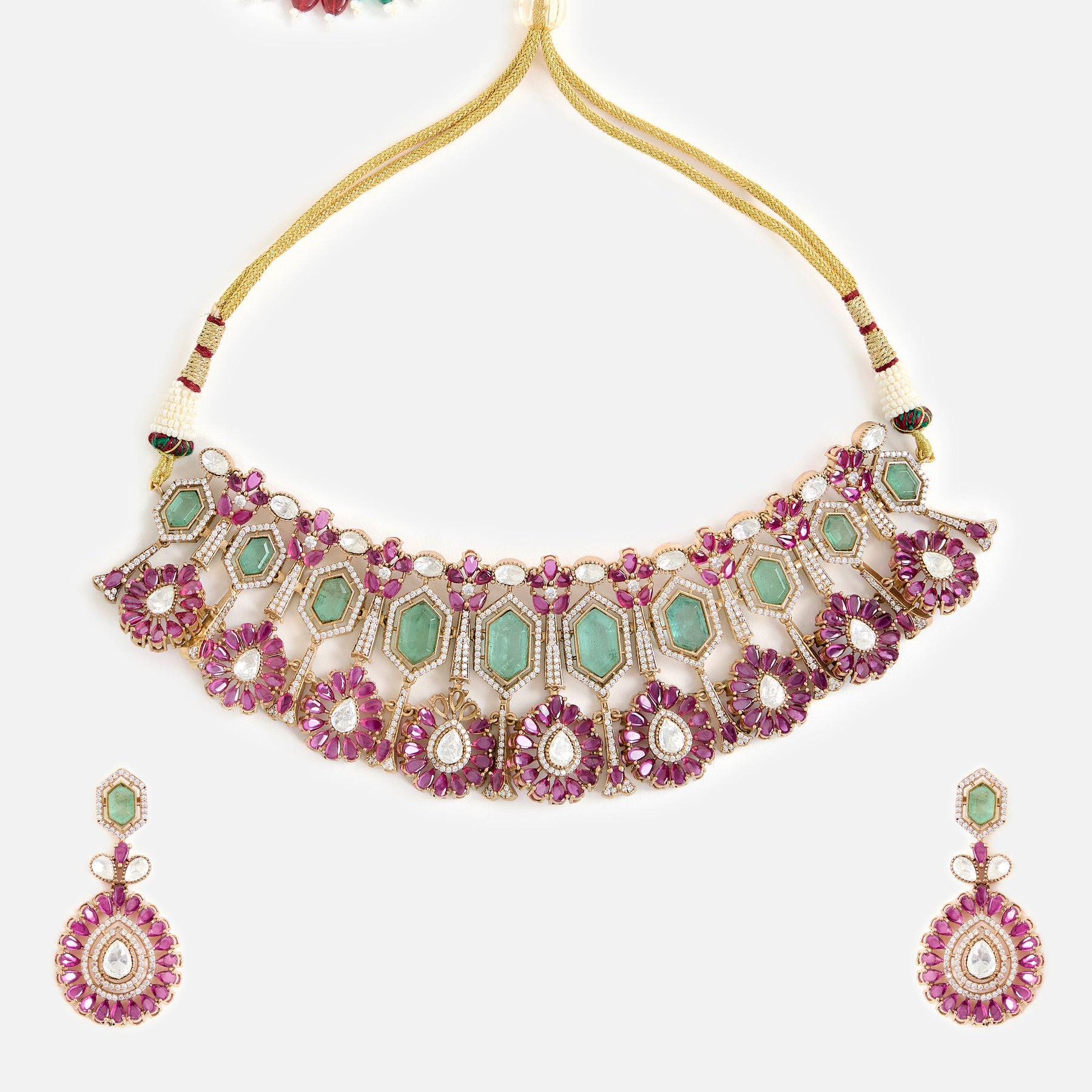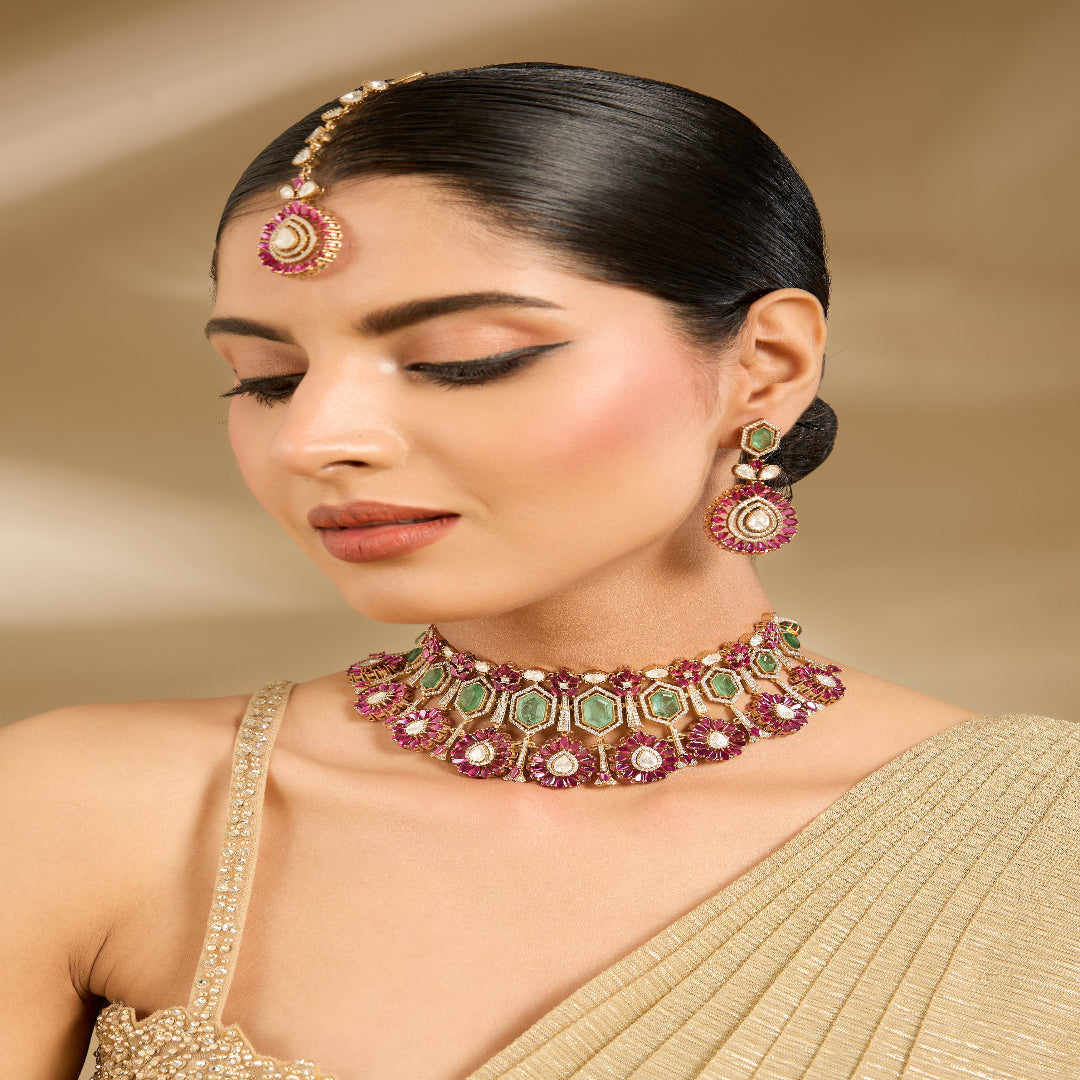 Elegant gold-plated choker necklace set embellished with green and pink stones, paired with matching earrings and maang tikka, perfect for weddings and festive occasions