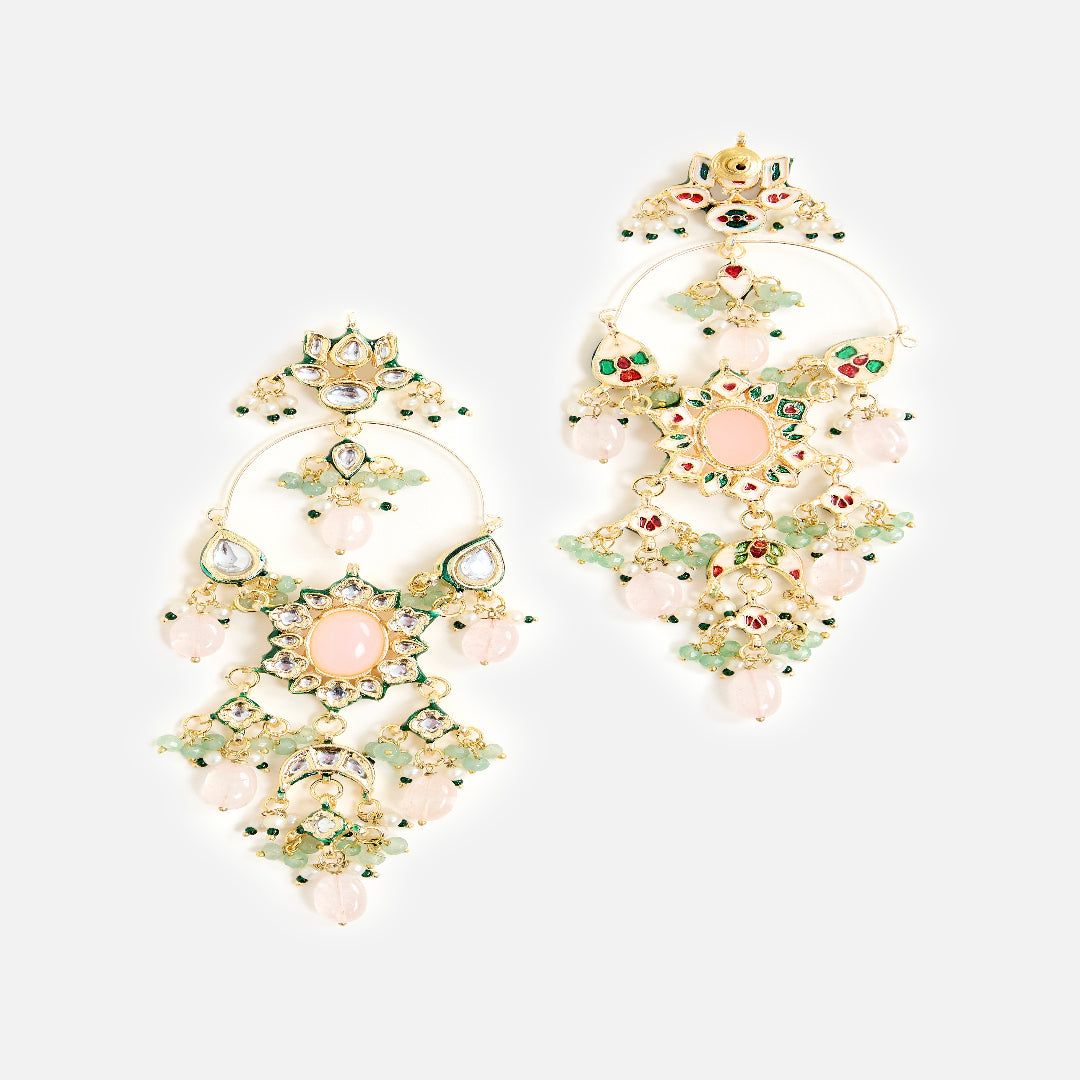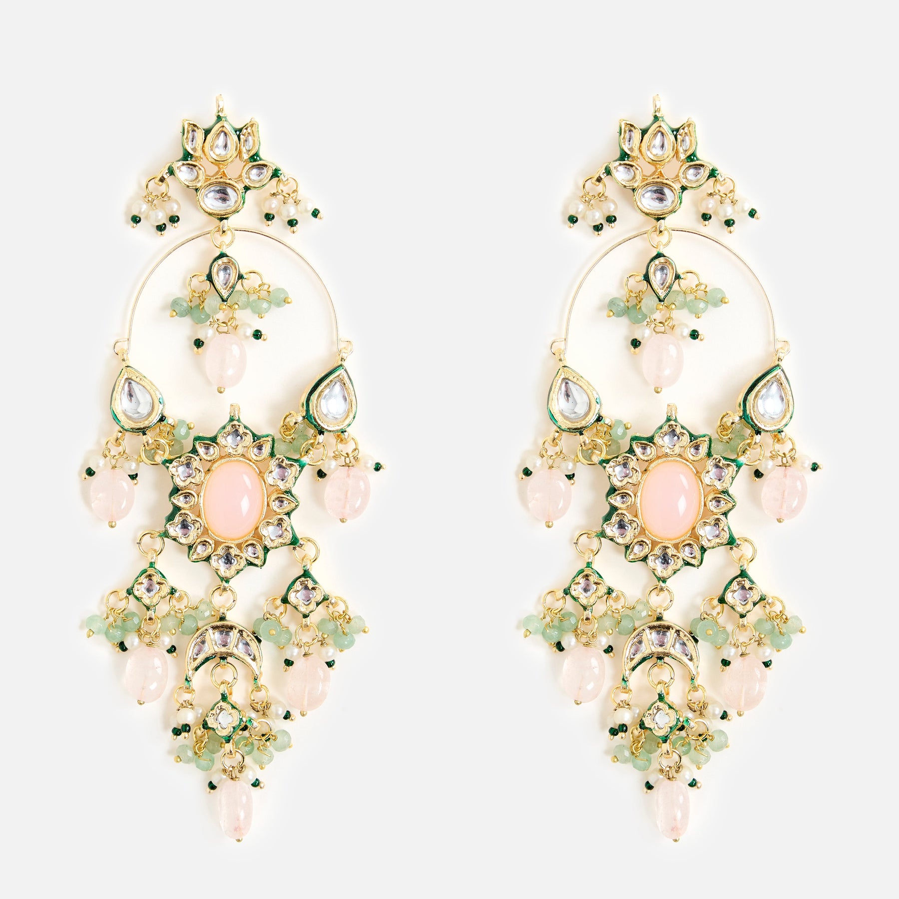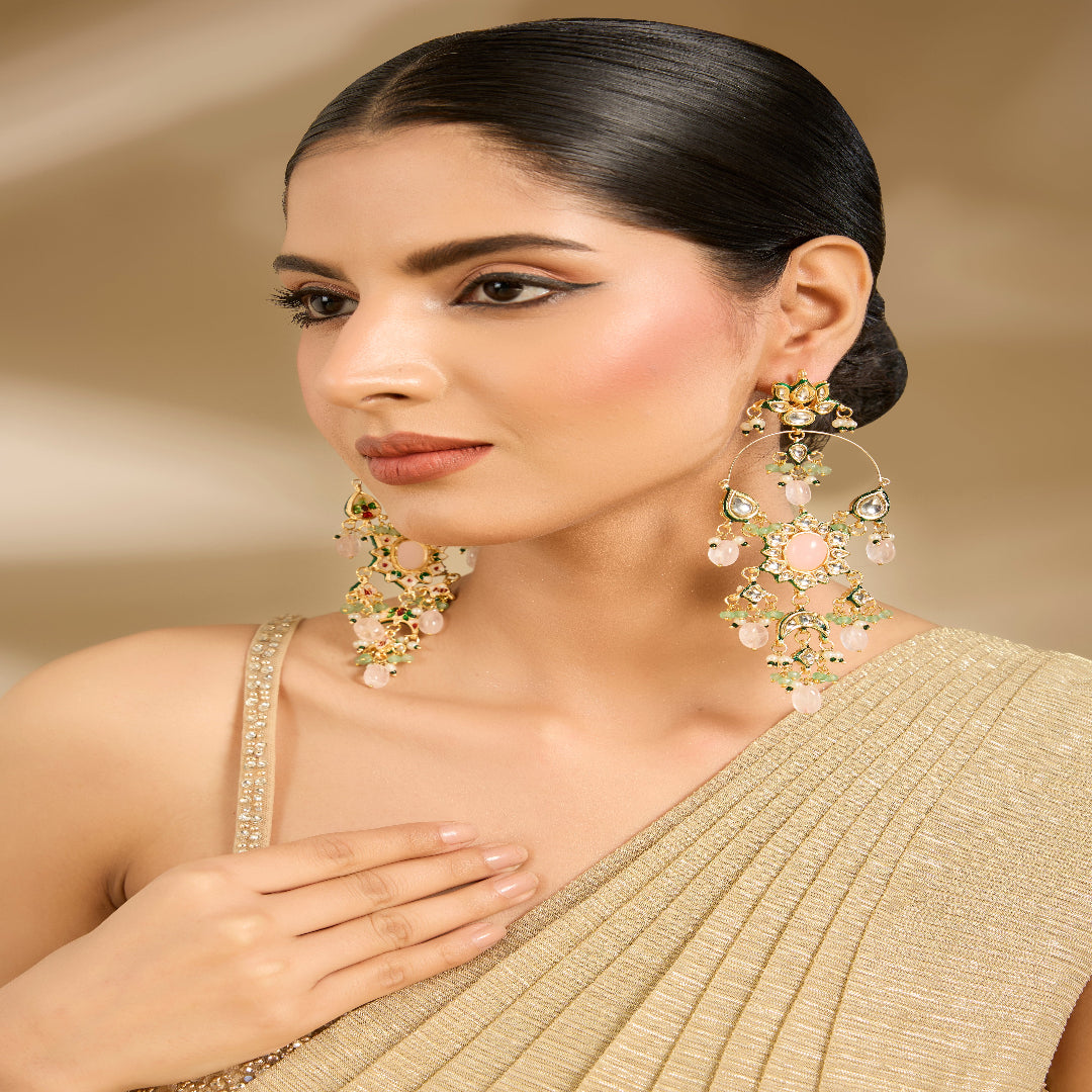 Make a bold statement with these exquisite chandelier earrings, adorned with pastel pink stones and green accents. Perfect to pair with sarees or lehengas for weddings and festive occasions.