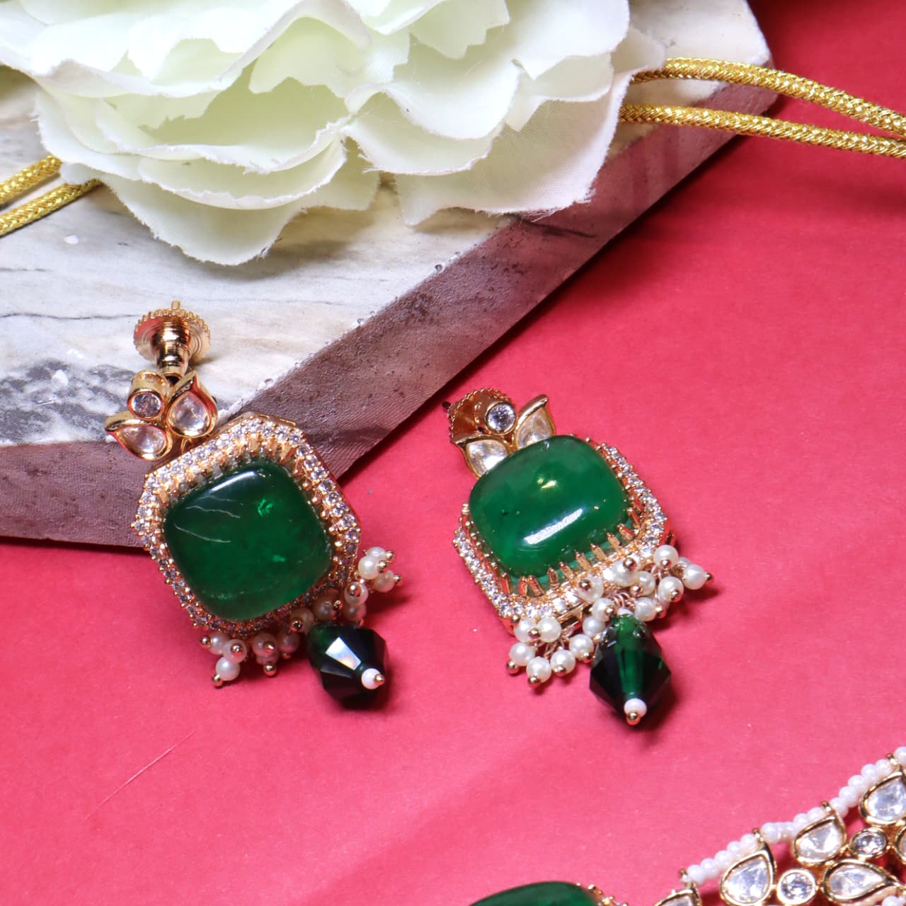 This exquisite necklace collection features stunning craftsmanship with vibrant gemstone accents and intricate Kundan detailing. Each set combines elegance and tradition — from the royal blue square stones to the fiery red teardrop centerpiece and the soft pink square gem surrounded by pearls. The delicate beadwork and floral motifs enhance their regal charm, making them perfect for weddings, festive occasions, or elegant soirées. These necklace sets beautifully blend timeless artistry with a touch of modern sophistication.