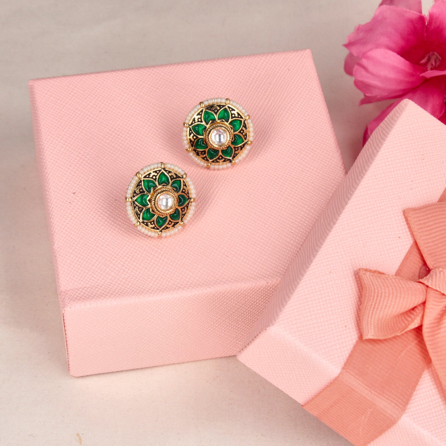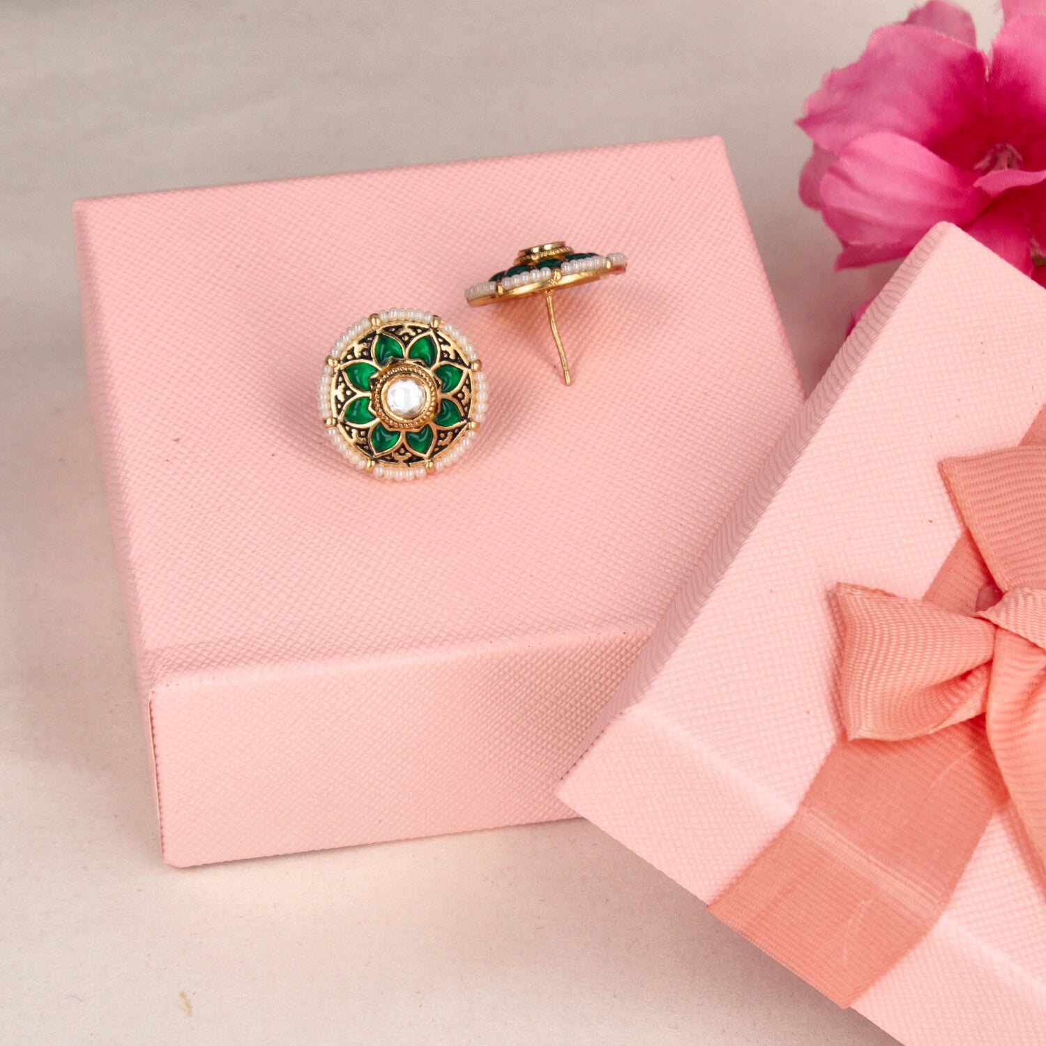 Green Floral Kundan Stud Earrings with Pearl Border - SIA458222
