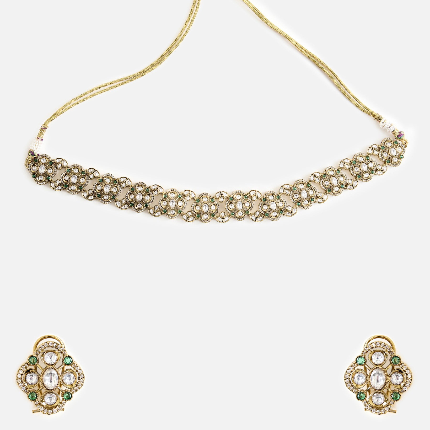 Exquisite gold-toned floral choker necklace embellished with sparkling stones and pearls. Perfect for weddings, festive occasions, and parties, adding timeless elegance and charm to any outfit.