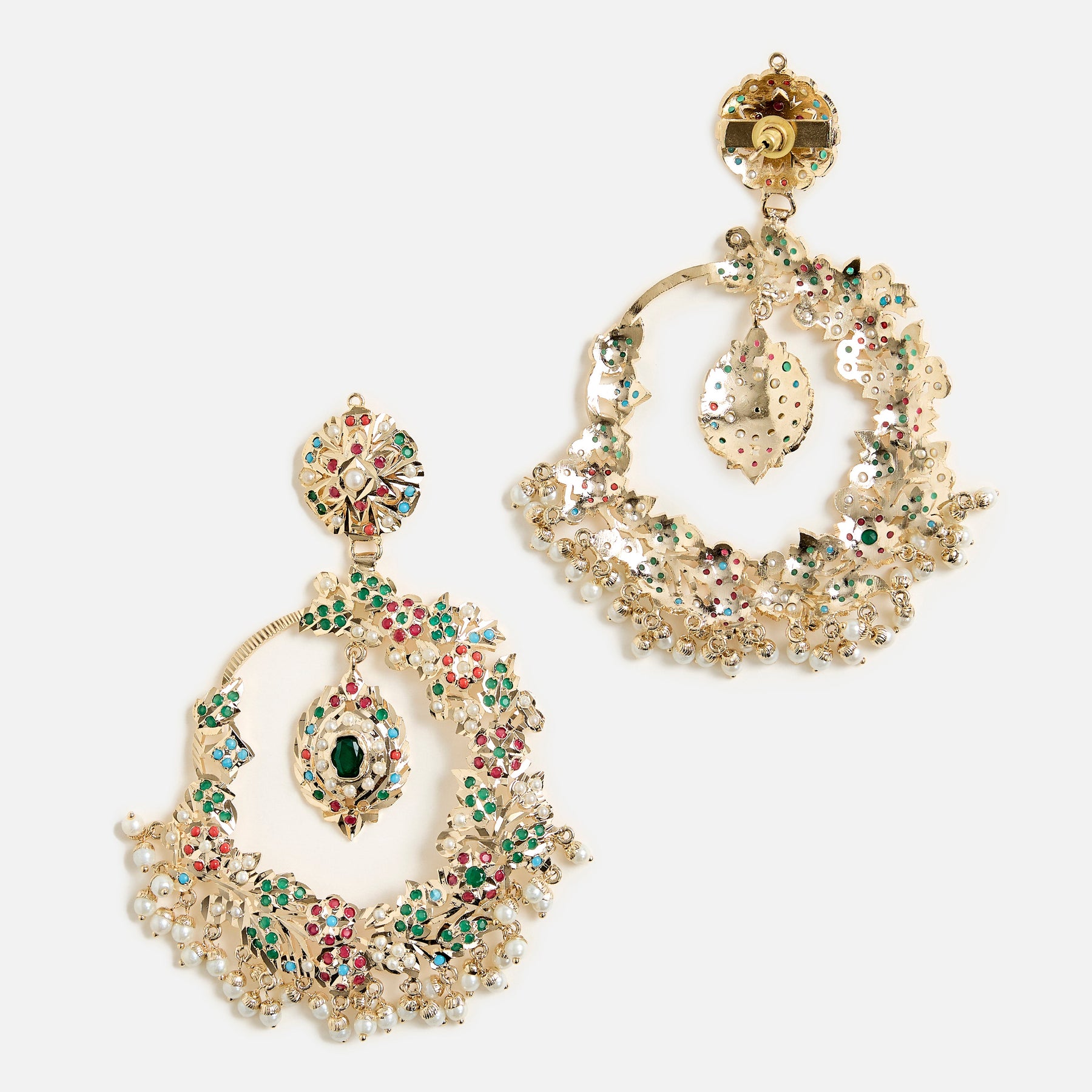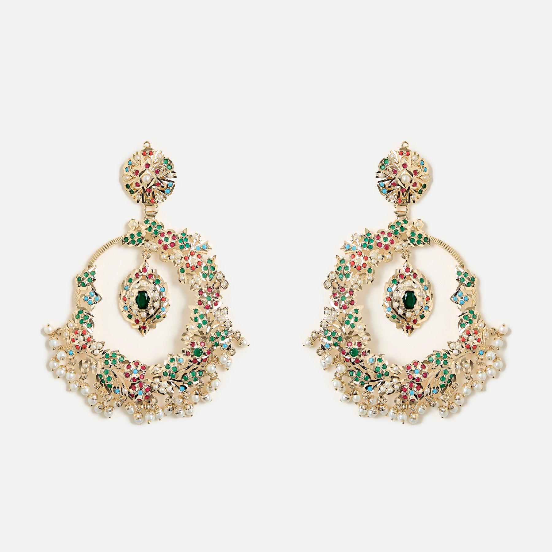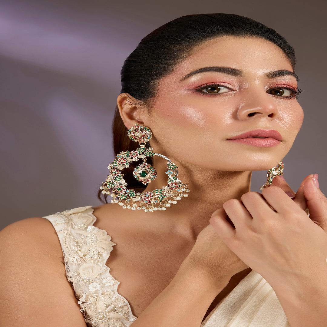 Stunning oversized chandbali earrings with intricate detailing, adorned with multicolor stones and pearl drops. A perfect statement accessory for weddings, festive occasions, and cultural celebrations.