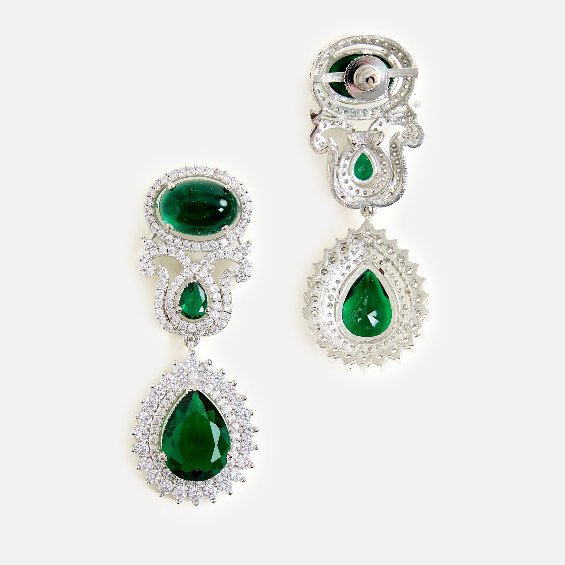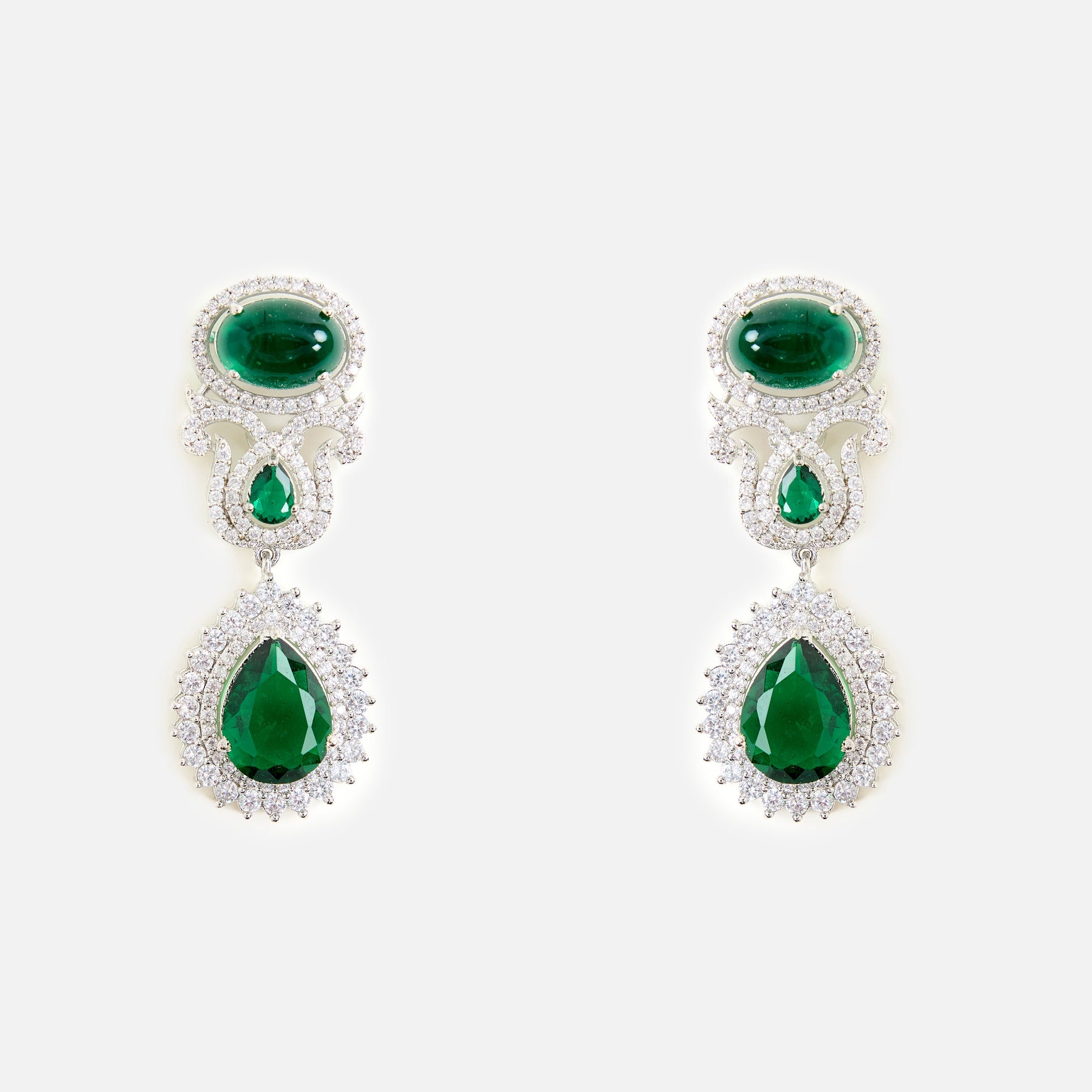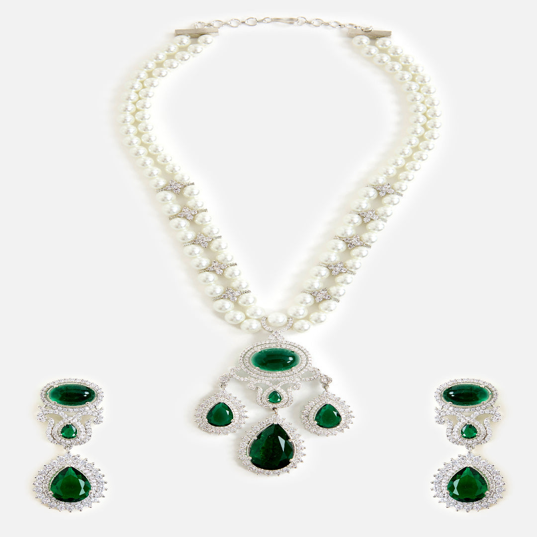 A graceful pearl and green stone necklace set featuring a layered design with matching earrings. Perfect for weddings, festive occasions, and parties, adding timeless elegance to any attire.