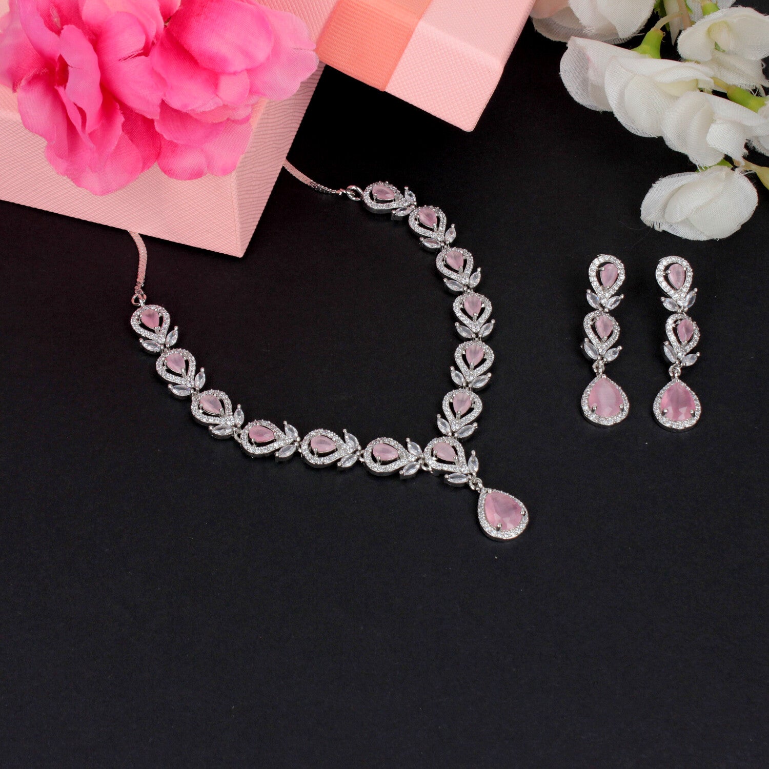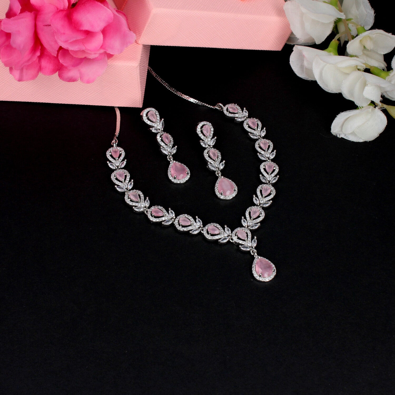 Rhodium-Plated Rose Pink Necklace Set - SIA459472